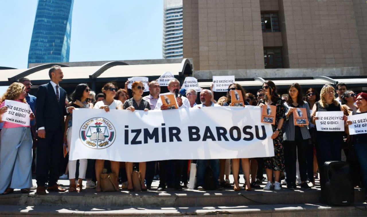 İzmir Adliyesi C Blok kapısı önünde bir açıklama yapan İzmir Barosu Başkanı Av. Özkan Yücel, “Kendisini ülkenin sahibi sanıyor. Kimse ses çıkarmayacak, kimse itiraz etmeyecek, kimse karşı çıkmayacak sanıyor. Bizi hain, vandal, eşkiya, terörist, çürük ya da sürtük sananlara üzücü bir haberimiz var; biz, bunların hiçbiri değiliz, biz halkız, halkın kendisini ve mücadelesini temsil ediyoruz. Hiçbir şansınız yok, gideceksiniz. Biz Gezi’ciyiz siz gidici…” dedi.