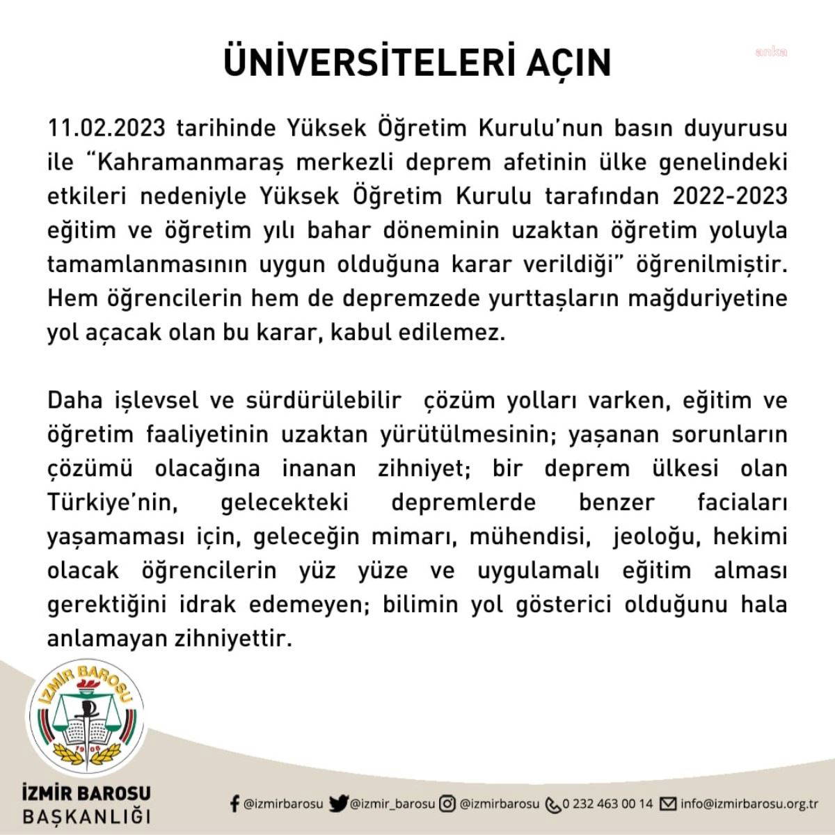 Yükseköğretim Kurumu'nun (YÖK) üniversitelerde 2022-2023 eğitim öğretim yılı bahar döneminin uzaktan eğitimle tamamlanmasına ilişkin dün aldığı karara İzmir Barosu’ndan tepki geldi.