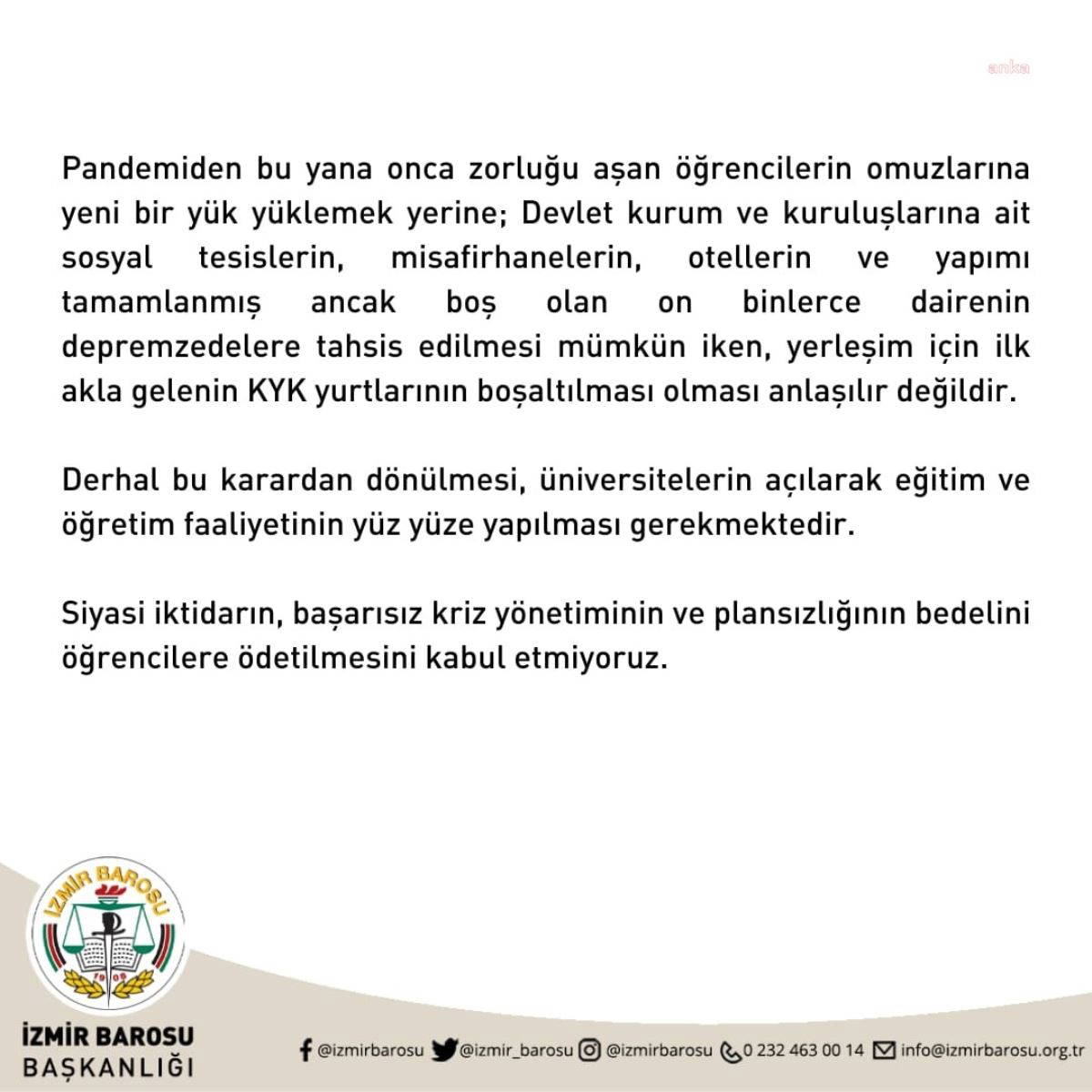 İzmir Barosu’ndan bugün yapılan yazılı açıklamada, alınan bu kararın hem öğrencilerin hem de depremzede yurttaşların mağduriyetine yol açacağı belirtildi.