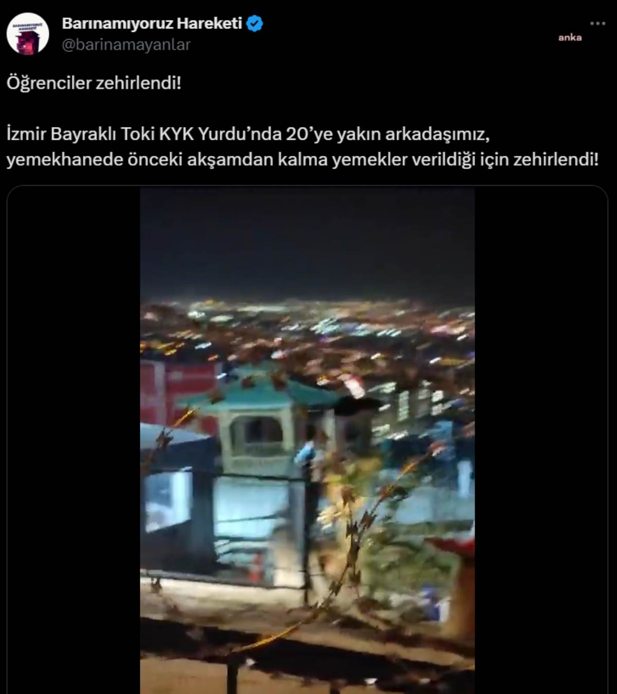 Barınamıyoruz Hareketi, sosyal medya hesabından İzmir Bayraklı TOKİ Kredi ve Yurtlar Kurumu (KYK) Yurdu’nda 20’ye yakın öğrencinin yemekhanede yemeklerden zehirlendiğini öne sürdü.