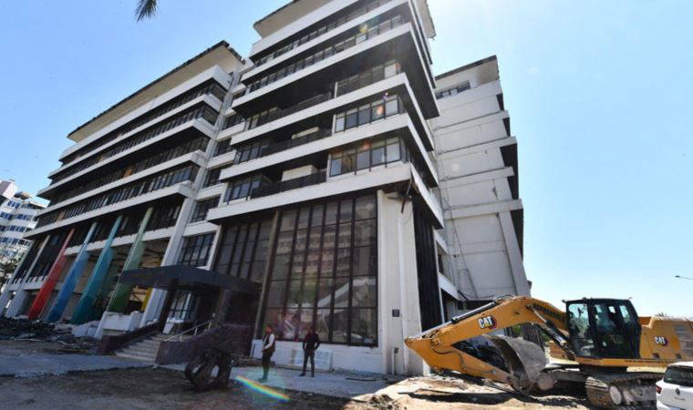 Depremde zarar gören İzmir Büyükşehir Belediyesi’nin ana hizmet binasında yıkımı başladı. Asbest önlemlerini alan yüklenici firmanın, çalışmaları 90 gün içerisine tamamlaması planlanıyor.