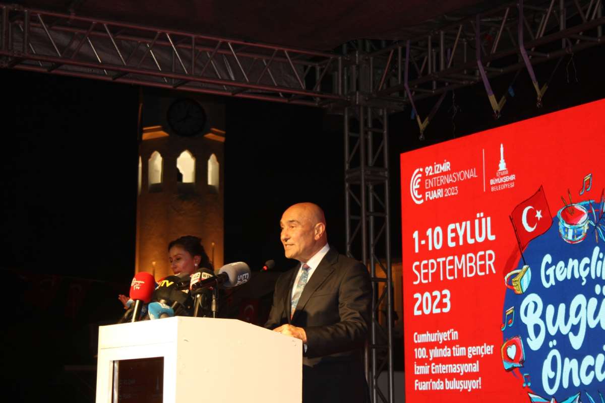 Ege'den yükselen fuar coşkusunun, tüm dünyaya umut olarak yükseleceğini söyleyen İzmir Büyükşehir Belediye Başkanı Tunç Soyer, "Fuarımız İZFAŞ tarafından, İzmir Büyükşehir Belediyemizin ev sahipliği ve Ticaret Bakanlığımızın himayesinde 92. kez düzenleniyor. Ege’den yükselen fuar coşkusu tüm Türkiye’ye umut olmak için kapılarını aralıyor. Cumhuriyetimizin 100. yılını kutlamaya sayılı günler kala, sizleri bu güzel günde, İzmir Büyükşehir Belediye Başkanı unvanıyla selamladığım için büyük bir onur duyuyorum. İzmir Enternasyonal Fuarı bundan bir asır önce atalarımızın kurduğu Türkiye Cumhuriyeti’nin, kendini uluslararası ölçekte tanıttığı ilk ve öncü markasıdır. İzmir, 9 Eylül ile kurtuluşun, İktisat Kongresi ile iktisadi kuruluşun, misak-ı iktisadinin ve İzmir Enternasyonal Fuarı ile iktisadi dirilişin şehridir. Bugün Cumhuriyetimiz bu üç kilit taşının üzerinde yükselmektedir. İşte bu nedenle 9 Eylül de, İktisat Kongresi de, İzmir Enternasyonal Fuarı da geleceğin Türkiyesi’nin inşası için temel tarihi referansıdır" dedi.