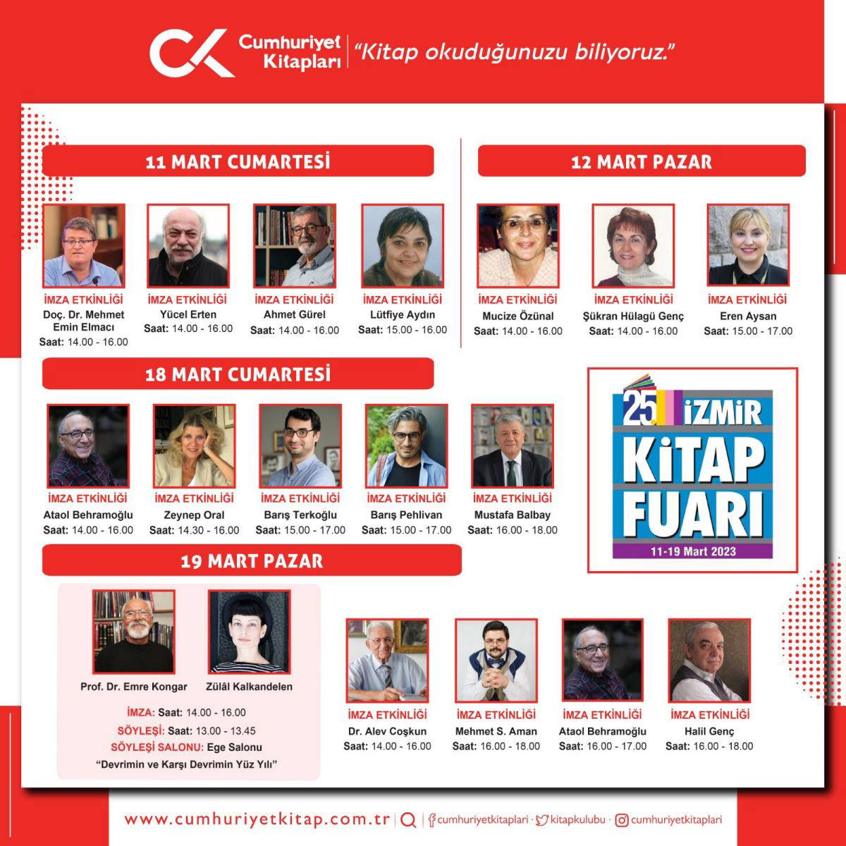 9 gün sürecek fuar boyunca düzenlenecek özel etkinliklerde Cumhuriyet Vakfı Yönetim Kurulu Başkanı ve Cumhuriyet Gazetesi İmtiyaz Sahibi Alev Coşkun’un yanı sıra, şair ve yazar Ataol Behramoğlu, Prof. Dr. Emre Kongar, Zülâl Kalkandelen, Zeynep Oral, Barış Terkoğlu, Barış Pehlivan, Mustafa Balbay gibi isimler okurlarıyla buluşacak. 11 Mart Cumartesi günü Yücel Erten, Ahmet Gürel, Doç. Dr. Mehmet Emin Elmacı 14.00’da, Lütfiye Aydın ise 15.00’da imza etkinliğinde okurlarıyla bir araya gelecek. 12 Mart Pazar günü ise 14.00’da Mucize Özünal, Şükran Hülagü Genç, 15.00’da da Eren Aysan kitaplarını imzalayacak. 18 Mart tarihinde şair ve ünlü Türk düşünürü Ataol Behramoğlu 14.00’da, Zeynep Oral 14.30’da, Barış Terkoğlu ve Barış Pehlivan 15.00’da, Mustafa Balbay ise 16.00’da okurlarıyla imza etkinliğinde bir araya gelecek. Fuarın spn gününde ise, 13.00’da Fuar İzmir Ege Salonu’nda düzenlenecek “Devrimin ve Karşı Devrimin Yüz Yılı” adlı söyleşide Prof. Dr. Emre Kongar, Zülâl Kalkandelen konuşmacı olarak katılacak. Cumhuriyet Vakfı Yönetim Kurulu Başkanı ve Cumhuriyet Gazetesi İmtiyaz Sahibi Alev Coşkun’un katılacağı imza etkinliği 14.00’da yapılacak. Aynı gün şair ve yazar Ataol Behramoğlu, Halil Genç ve Mehmet S. Aman ise 16.00’da okurlarıyla buluşacak.