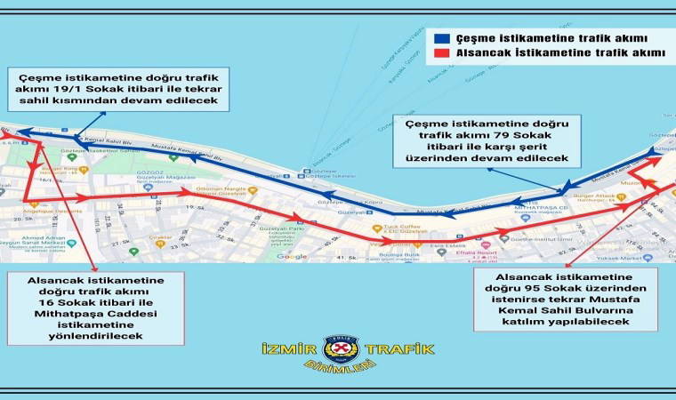Mustafa Kemal Sahil Bulvarında saat 17.00’dan itibaren kutlamalar kapsamında tedbir alınacak, trafik o yollara aktarılacak. Yapılan açıklamada “Merkez (Konak) istikametinden Otoyola (Çeşme) giden trafik akımı, Göztepe kavşağından itibaren yolun kara tarafına verilecek olup, Depo kavşağından itibaren tekrar sahil tarafına aktarılacaktır. Otoyol (Çeşme) istikametinden Merkez (Konak) istikametine giden trafik akımı ise Depo kavşağından 16 Sokağa ve akabinde Mithatpaşa Caddesine yönlendirilecektir. Göztepe kavşağı 95 sokaktan tekrar Mustafa Kemal Sahil Bulvarına aktarılacaktır” denildi.
