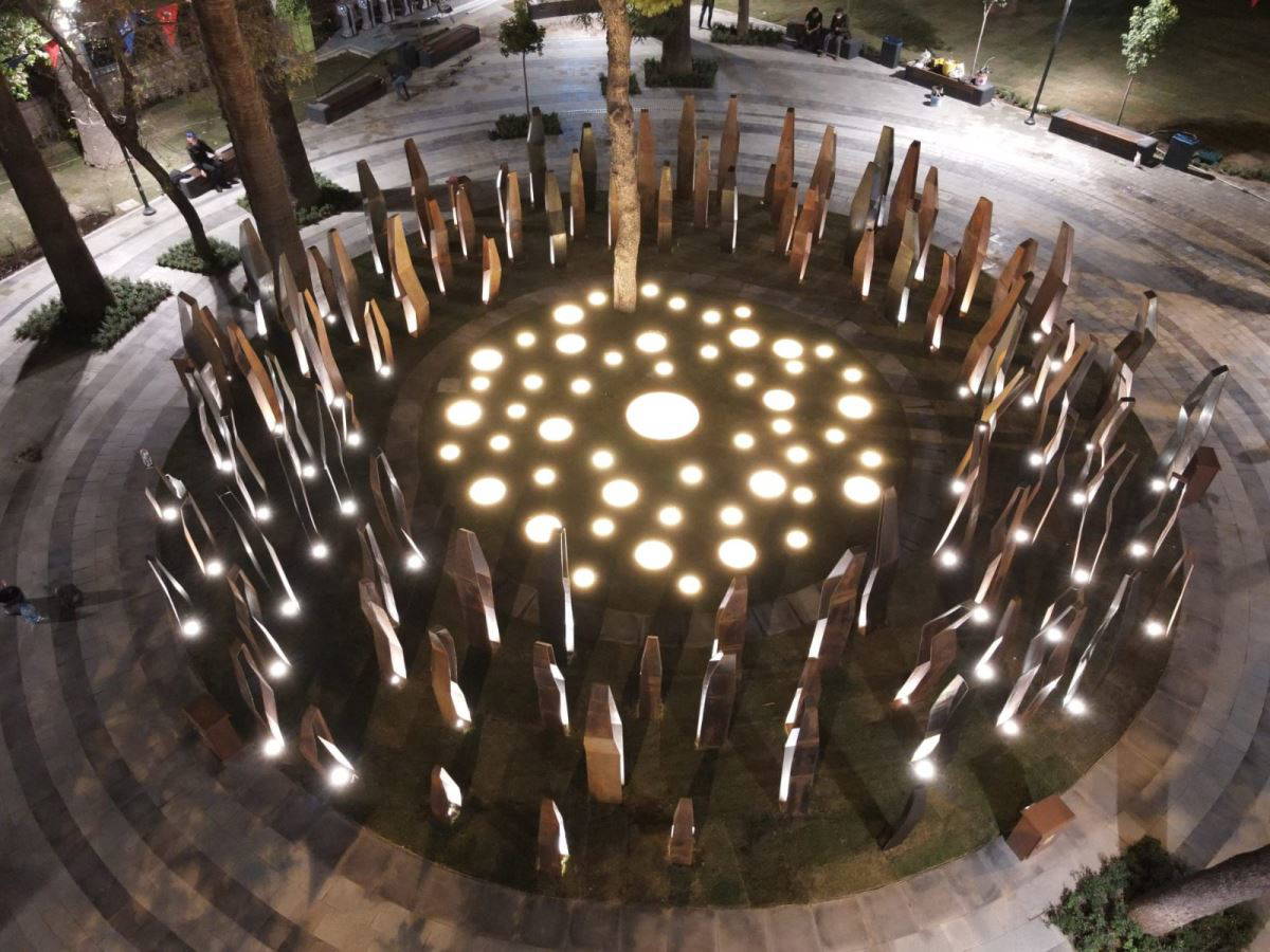 Katledilen 103 yurttaşı temsil eden farklı boy, genişlik ve formlardaki birimler merkeze doğru yönelen bir çember oluşturuyor. Bu çember, yaşam döngüsünü temsil ediyor. Heykel malzemesi olarak seçilen korten (yerinde dönüşen ve yaşayan) malzemenin zaman içerisinde değişime uğraması, kızıla dönmesi ve direncini korumaya devam etmesi, kaybedilen 103 yurttaşın sembolik olarak bu alanda yaşama fikrini güçlendiriyor. Her biri özgün nitelikte biçimlenmiş heykel biriminin zeminindeki ışık kaynağı, çarptığı formun yönelişine göre farklı şiddetlerde ve açılarda ışık yayarak her bir birimde farklı yansıma oluşturuyor. Böylelikle 103 yurttaş ayrı ayrı temsil edilmiş oluyor.