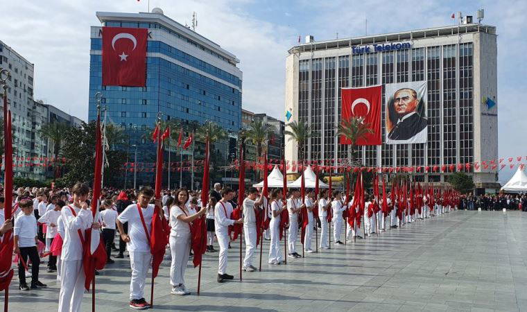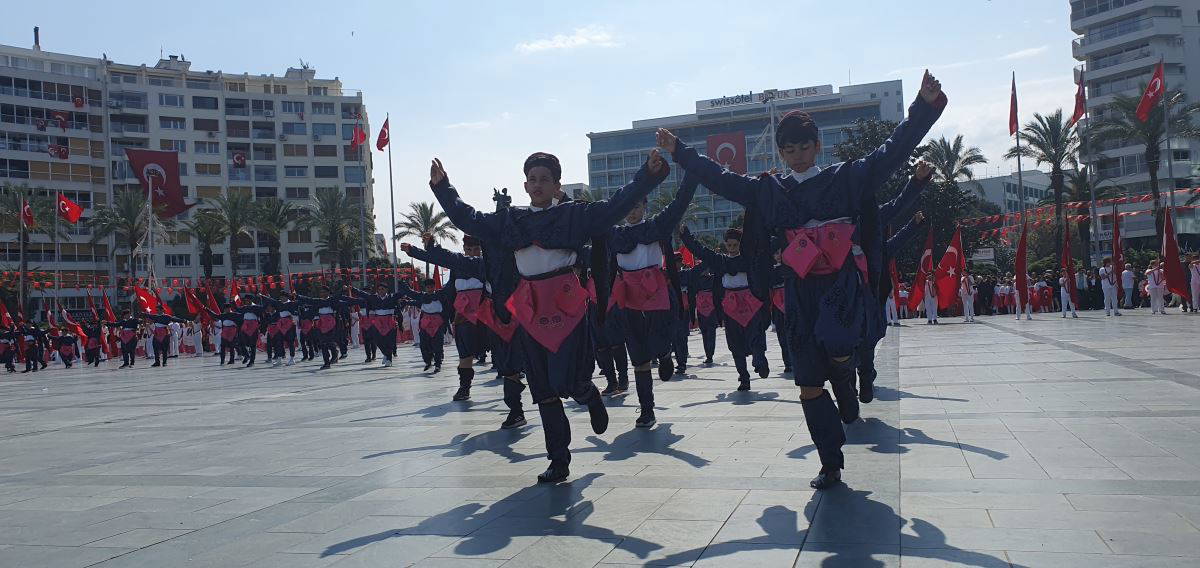 Atatürk Anıtı'na çelenk sunumu, saygı duruşu ve İstiklal Marşı ile başlayan resmi kutlama programına katılan İzmirliler kent genelindeki okullarda eğitim gören öğrencilerin sergiledikleri danslarla ve gösterilerle bayram coşkusuna ortak oldu.