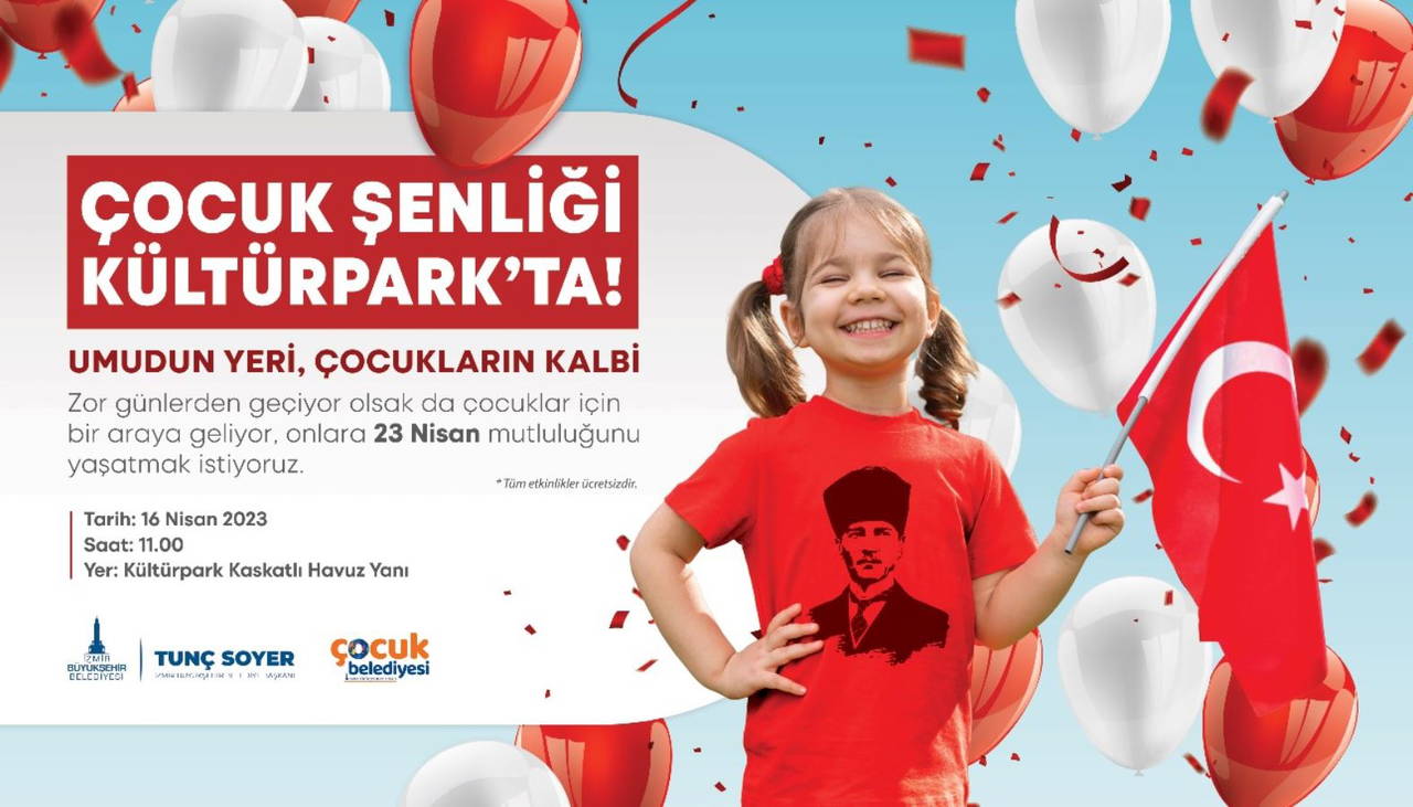 Kültürpark’taki Çocuk Şenliği 16 Nisan'da saat 11.00'de başlayacak. Kaskatlı Havuz yanında düzenlenecek programda 11.00 ile 14.00 arası çocuk, bilim ve kukla gösterilerinin olduğu çadır etkinlikleri yer alacak. Saat 13.00-16.00 arasında çocuk korolarının yer alacağı sahne etkinlikleri düzenlenecek. Açık alan etkinlikleri de saat 11.00-15.00 arasında yapılacak. Çocuklar kukla gösterileri, spor etkinlikleri, sokak oyunları, oyun parkuru, gezici kütüphane gibi birçok etkinlikle keyifli bir gün geçirecek.