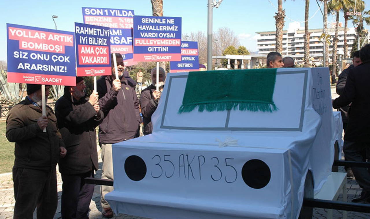 Saadet Partisi İzmir İl Başkanlığı, art arda gelen akaryakıt zamlarını renkli bir eylemle protesto etti. Tabut şeklinde kefenlenen 35 AKP 35 plakalı maket bir otomobil, Konak Meydanı'nda toplanan Saadet Partililer tarafından taşındı.