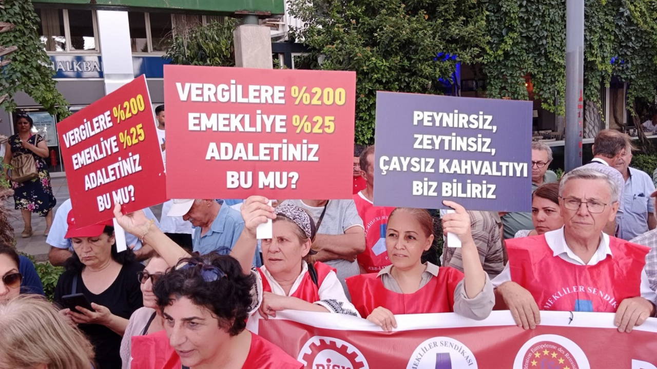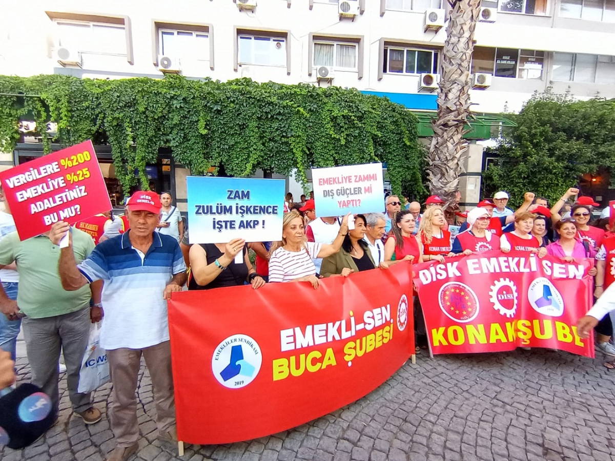 Konak Meydanında bugün bir araya gelen emekliler, işçiler ve yurttaşlar AKP iktidarını eleştirdi. Yurttaşların açtıkları “Peynirsiz, Zeytinsiz, Çaysız kahvaltıyı biz biliriz”, “Vergilere yüzde 200 emekliye yüzde 25 adaletiniz bu mu?”, “Gabar'daki petrol ne zaman gelir”, “Saray'a var emekliye yok mu?”, “Yokluk vatadaşın fıtratında mı var?”, “Söyleyecek sözümün yaşayacak günümüz var”, "Emekliye zammı dış güçler mi yaptı?" yazılı dövizler dikkat çekti.