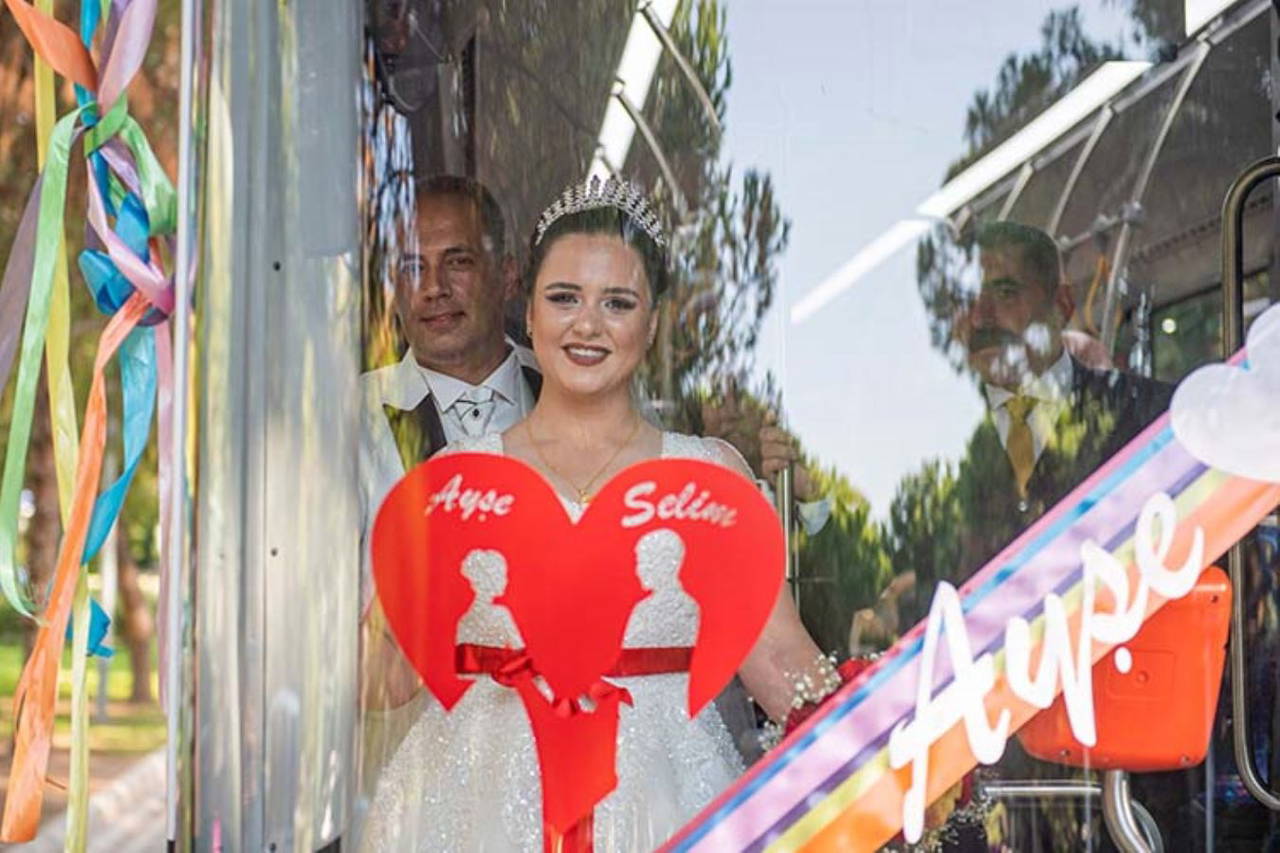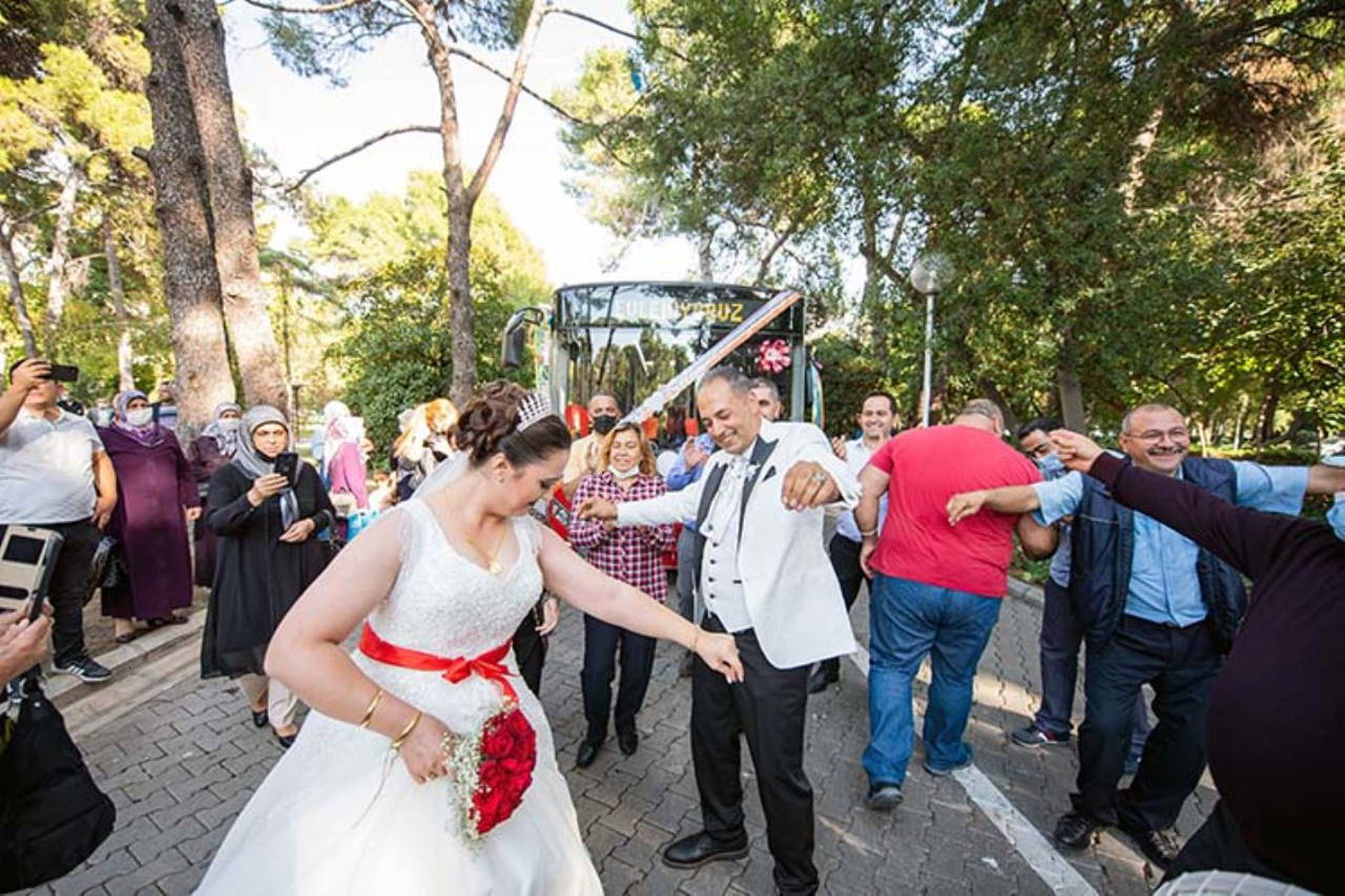 Gelin Ayşe Akyol, ESHOT Gediz Atölyesi'nde meslektaşları tarafından süslenen otobüsle evinden alındı. Otobüsle şehri turlayan çiftin nikahı, Kültürpark Evlendirme Dairesinde kıyıldı.