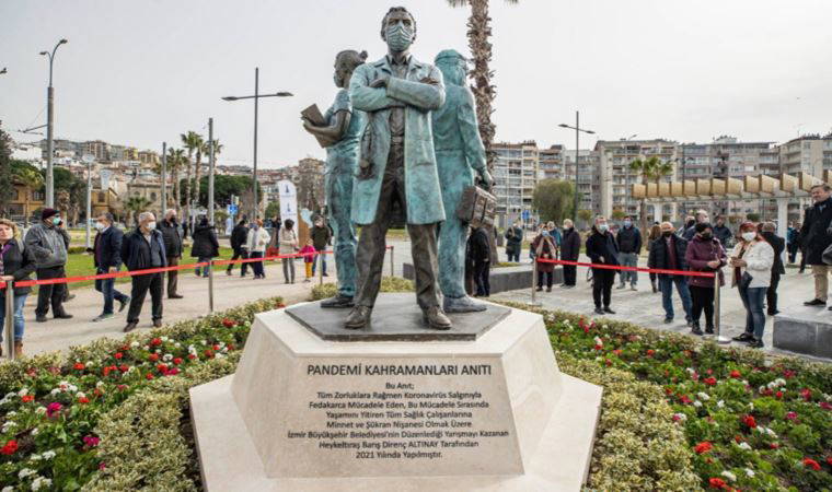 İzmir Büyükşehir Belediyesi tarafından pandemi süreci boyunca canlarını dişlerine takarak çalışan sağlık emekçileri için yaptırılan Pandemi Kahramanları Anıtı törenle açıldı. 14 Mart Tıp Bayramı etkinlikleri kapsamında 15 Temmuz Demokrasi Şehitleri Meydanı'na yerleştirilen Pandemi Kahramanları Anıtı'nın açılışına İzmir Büyükşehir Belediye Başkanı Tunç Soyer, CHP İzmir milletvekilleri Ednan Arslan, Tacettin Bayır, Kani Beko, CHP İzmir İl Başkanı Deniz Yücel, İzmir Büyükşehir Belediyesi Başkan Vekili Mustafa Özuslu, İzmir Büyükşehir Belediyesi Genel Sekreteri Dr. Buğra Gökçe, Konak Belediye Başkanı Abdül Batur, Menderes Belediye Başkanı Mustafa Kayalar, Karaburun Belediye Başkanı İlkay Girgin Erdoğan, Beydağ Belediye Başkanı Feridun Yılmazlar, İzmir İl Sağlık Müdür Yardımcısı Uzman Dr. Hüseyin Bozdemir, İzmir Tabip Odası Başkanı Lütfi Ç amlı, İzmir Büyükşehir Belediyesi bürokratları, İzmir Büyükşehir Belediyesi'ne bağlı şirketlerin genel müdürleri, sağlık emekçileri, meclis üyeleri, siyasi parti temsilcileri ve yurttaşlar katıldı.