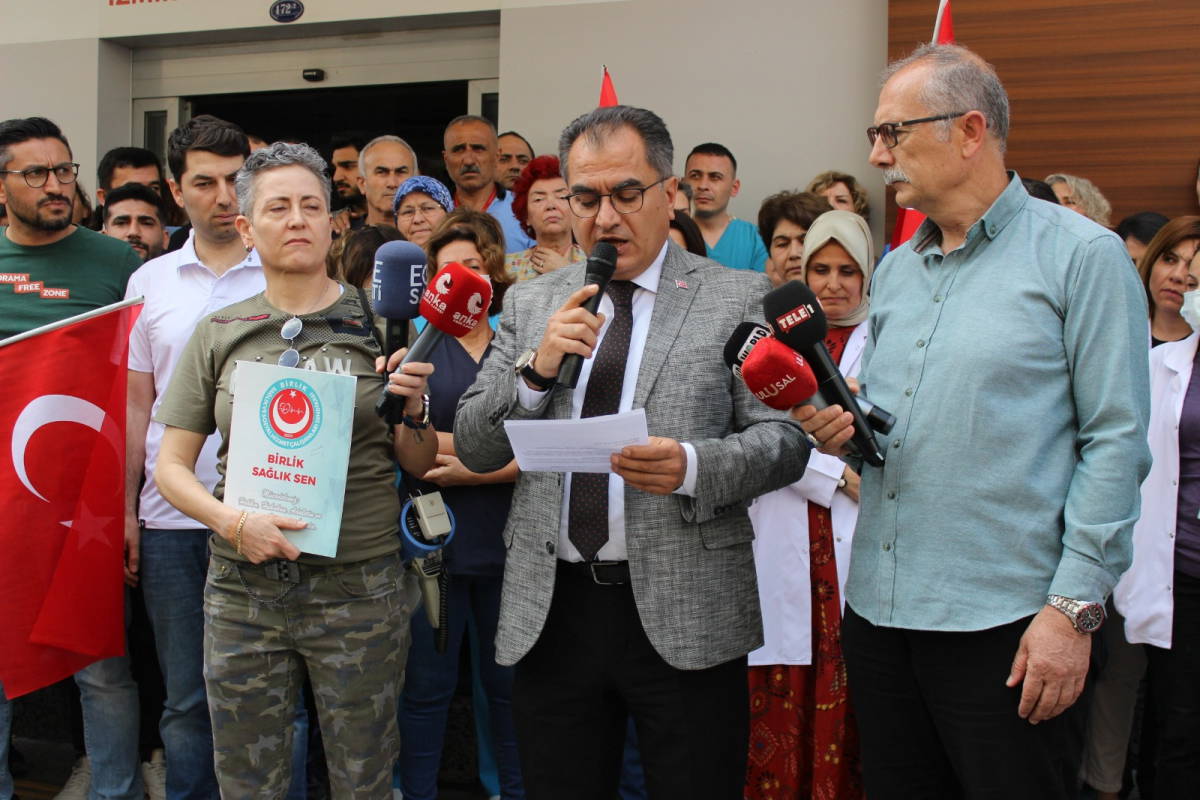 Sağlıkçının darp edilmesini hastane çalışanları, Birlik Sağlık Sen Genel Başkanı Ahmet Doğruyol ve sendika üyeleri tarafından protesto edildi.