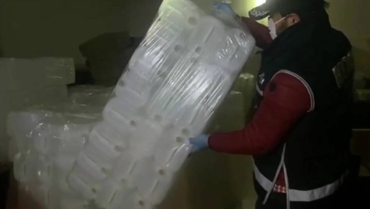 Yapılan teknik ve fiziki takibin ardından 1 imalathane, 1 depo ve 3 araçta yapılan baskınlarda 11 bin 60 litre etil alkol, 400 taklit etiket, 7 bin 500 bidon kapağı, 4 bin 605 karton kutu, 1530 boş bidon, 8 tane 26 bin 300 litre kapasiteli plastik tank, 1 metal dolum düzeneği, 1 dijital cihaz takılı basınçlı dolum makinesi, 5 krom damıtma kazanı, 5 su motoru, 1 karekod basma cihazı ve 1 bidon kapağı takma matkabı ele geçirildi.