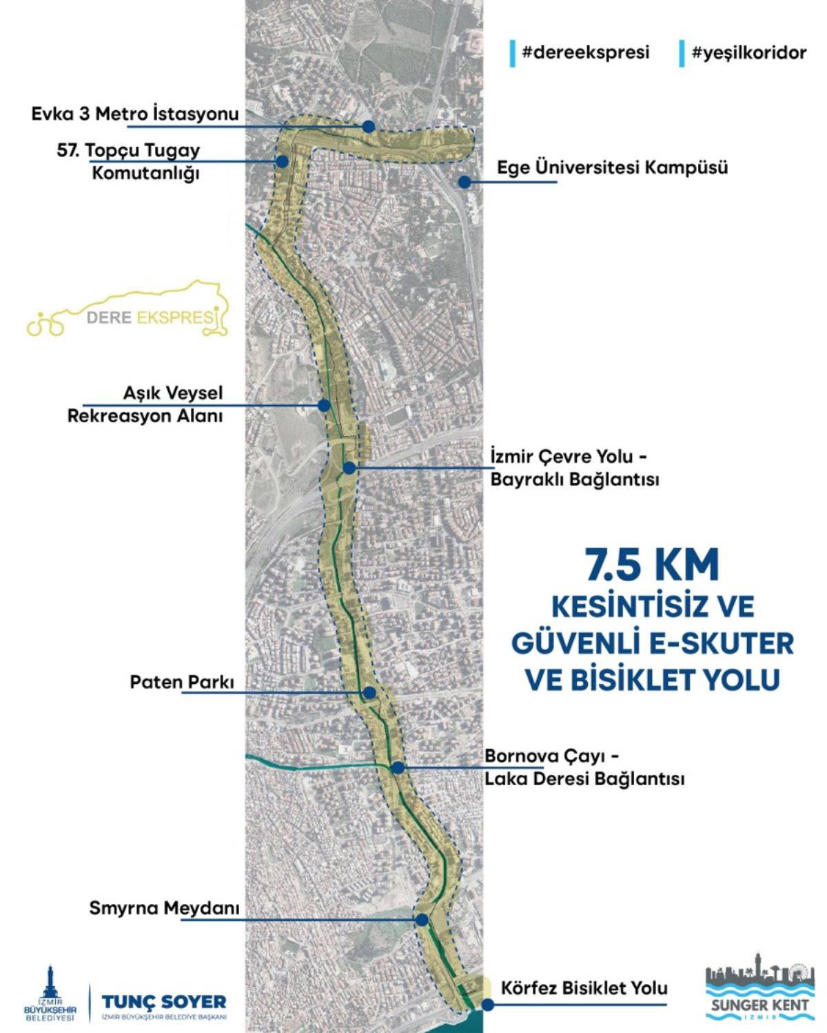 İzmir Büyükşehir Belediyesi son dönemde sayıları giderek artan elektrikli scooterların (e-skuter) güvenli bir şekilde kullanımı ve ulaşıma entegrasyonu için yeni bir projeyi hayata geçirecek. Pilot bölge olarak seçilen Bornova Çayı kıyısında e-scooterların güvenli ve kesintisiz ulaşımını için iki etaplı bir proje hazırlandı. Toplam 7,5 km uzunluğunda olacak e-scooter yolunun 4 km’lik etabının 2023 yılı içerisinde tamamlanması hedefleniyor. E-scooter yolu hattı Körfez Bisiklet Yolu’yla başlayıp EVKA 3 metro istasyonuna kadar devam edecek.