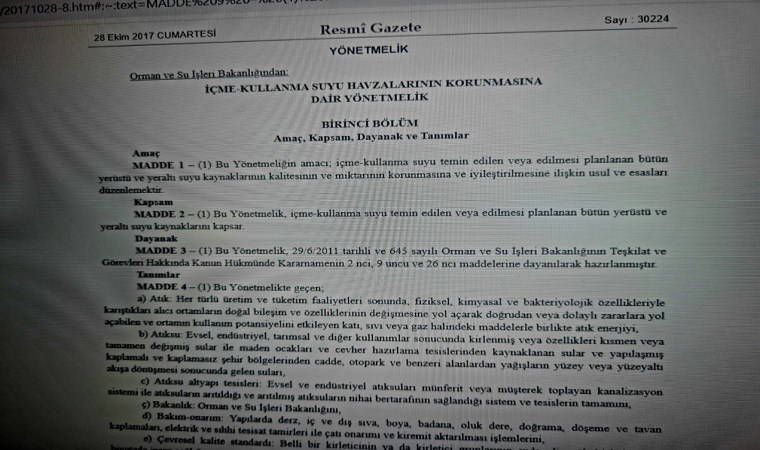 Maden Kanuna ilişkin, 28 Ekim 2017’de Resmi Gazetede yayınlanan “İçme- Kullanma Suyu Havzaların Korunmasına Dair Yönetmelikte”, önceden “orta ve uzun koruma mesafeli” alanlarda da çevreyi kirletecek “madencilik faaliyetlerine” izin verilmezken bu kısıtlama “kısa ve mutlak koruma mesafesinde bulunan” madenlere” indirgendi.