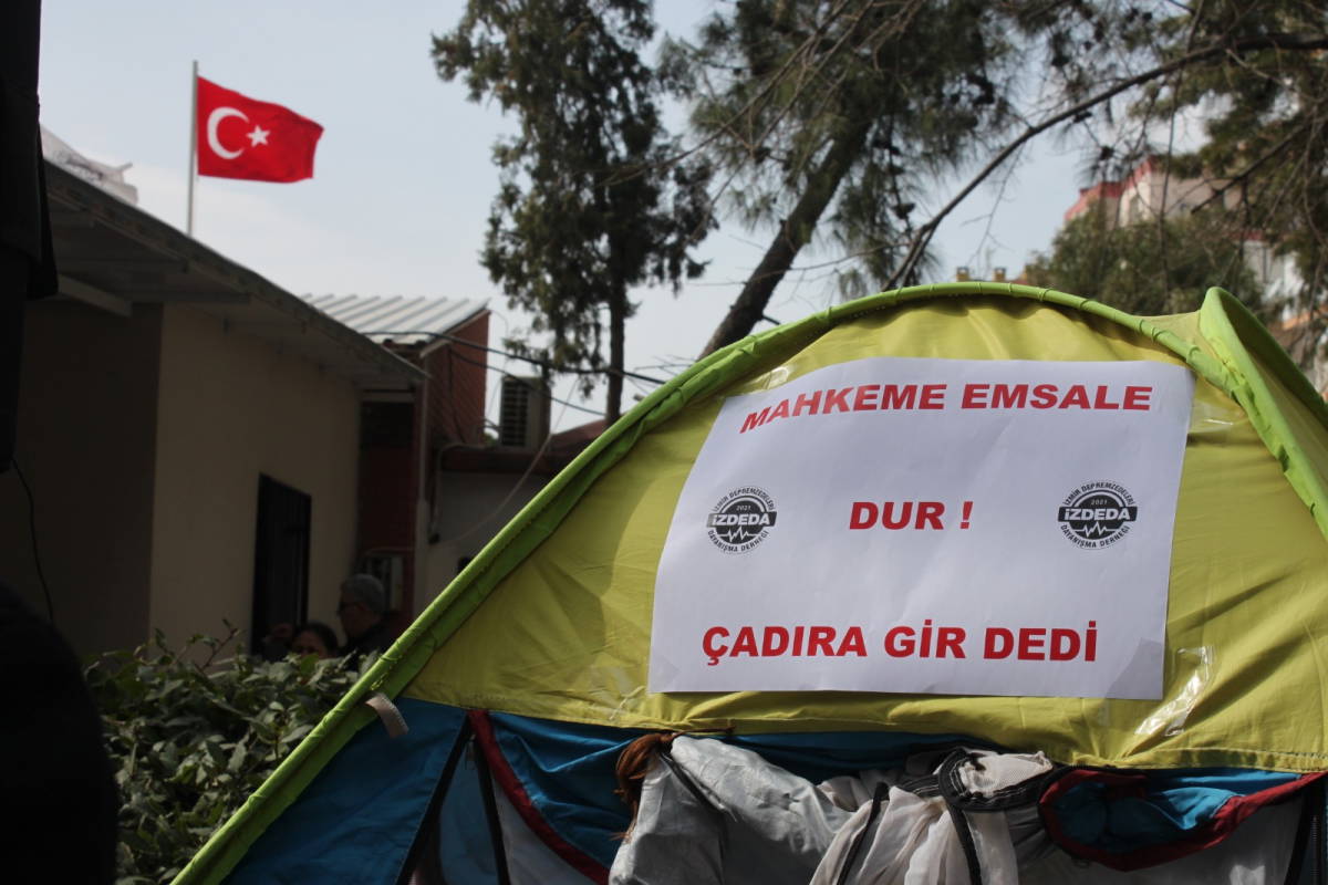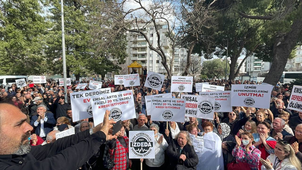 Açıklamayı okuyan İZDEDA Başkanı Haydar Özkan, Kahramanmaraş merkezli yaşanan depremlerde hayatını kaybedenler için başsağlığı dileyerek, “Bugün burada toplanmamızın sebebi, günümüze kadar hangi isteklerimiz yerine getirildi, ne kadarı karşılandı, bunları konuşmak dertleşmek olacakken, mahkemeden aldığımız bir haber konuyu farklı yönlere götürdü. 30 Ekim 2020’den bu yana sadece Bayraklı bölgesinde 2 apartmanın inşaatı bitti, 75 adet ruhsat alındı, Buca bölgesinde ve diğer ilçelerimizde 10 adet inşaatımız devam etmekte. Bu inşaatlar belediyeden almış olduğumuz emsal artışı sayesinde hareketlendi. Mahkemenin almış olduğu yürütmeyi durdurma kararı haberi bizleri yıktı, yolumuzu kapattı, umut ışığımızı söndürdü.