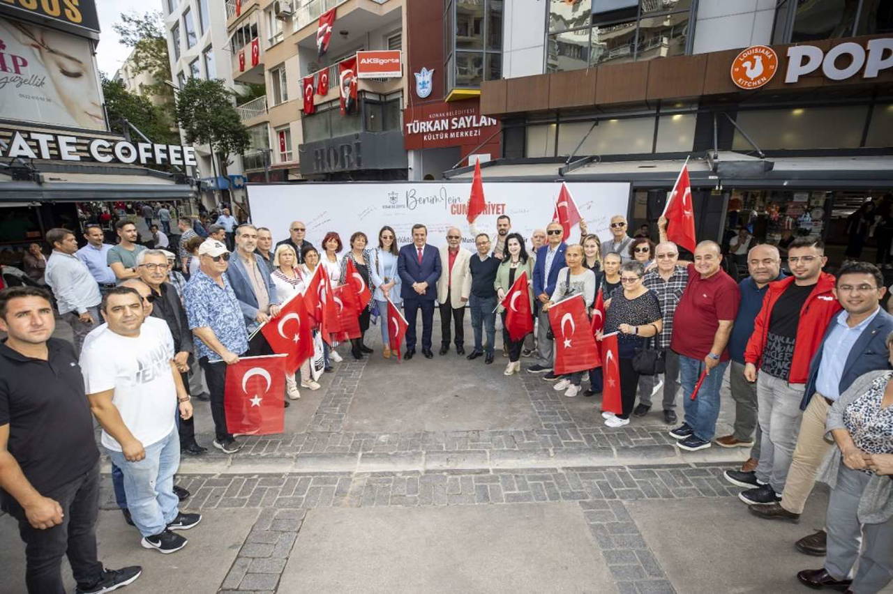 Cumhuriyet’in 100. kuruluş yıldönümünü kentin dört bir yanında düzenlediği etkinliklerle kutlayan Konak Belediyesi, Alsancak Kıbrıs Şehitleri Caddesi girişinde de anlamlı bir etkinlik düzenledi. Vatandaşın Cumhuriyetle ilgili duygularını kelimelere dökebilmesi, Cumhuriyet sevgisinin hep birlikte yaşanması için Türkan Saylan Kültür Merkezi önüne “Benim için Cumhuriyet, 100. Yıl Düşünce Duvarı” yerleştirildi. Duvara ilk yazıyı Konak Belediye Başkanı Abdül Batur yazarken Alsancak bölgesi muhtarları da etkinlikte yer alarak duygu ve düşüncelerini yazıya döktü. İzmirlilerin büyük ilgi gösterdiği etkinlikte duvar kısa sürede dolarken vatandaşlar 100’üncü yılında Cumhuriyet’i “Bağımsızlık, Özgürlük, Kurtuluş, Aşk, Kardeşlik, Eşitlik, Adalet, insan Hakları” gibi aydınlık sözcüklerle tanımladı.