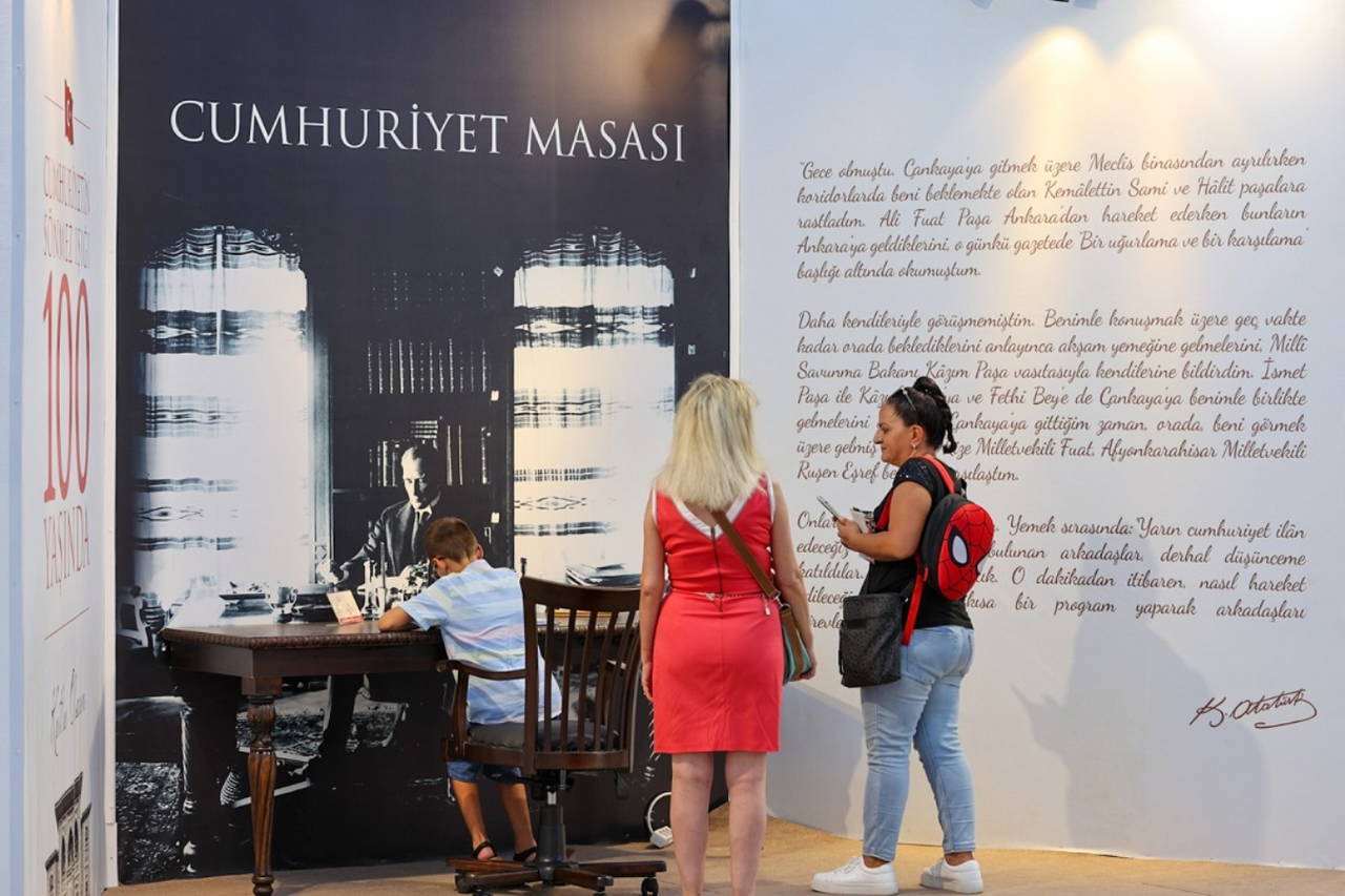 Kültürpark’ın Lozan kapısı girişine kurulan 100. Yılda Cumhuriyet Tüneli ziyaretçilerden yoğun ilgi gördü. Hexagonal Led’li düzenek ile tünel içerisinden geçen ziyaretçiler Cumhuriyet kurgulu prodüksiyonda Mustafa Kemal Atatürk ve silah arkadaşlarının verdiği Milli Mücadele’den Cumhuriyet devrimlerine kadar geçen tüm süreci izledi. İzmir Büyükşehir Belediyesi standında yer alan Cumhuriyet Masası’nda İzmirliler 100. yıl için açılan anı defterini imzaladı.