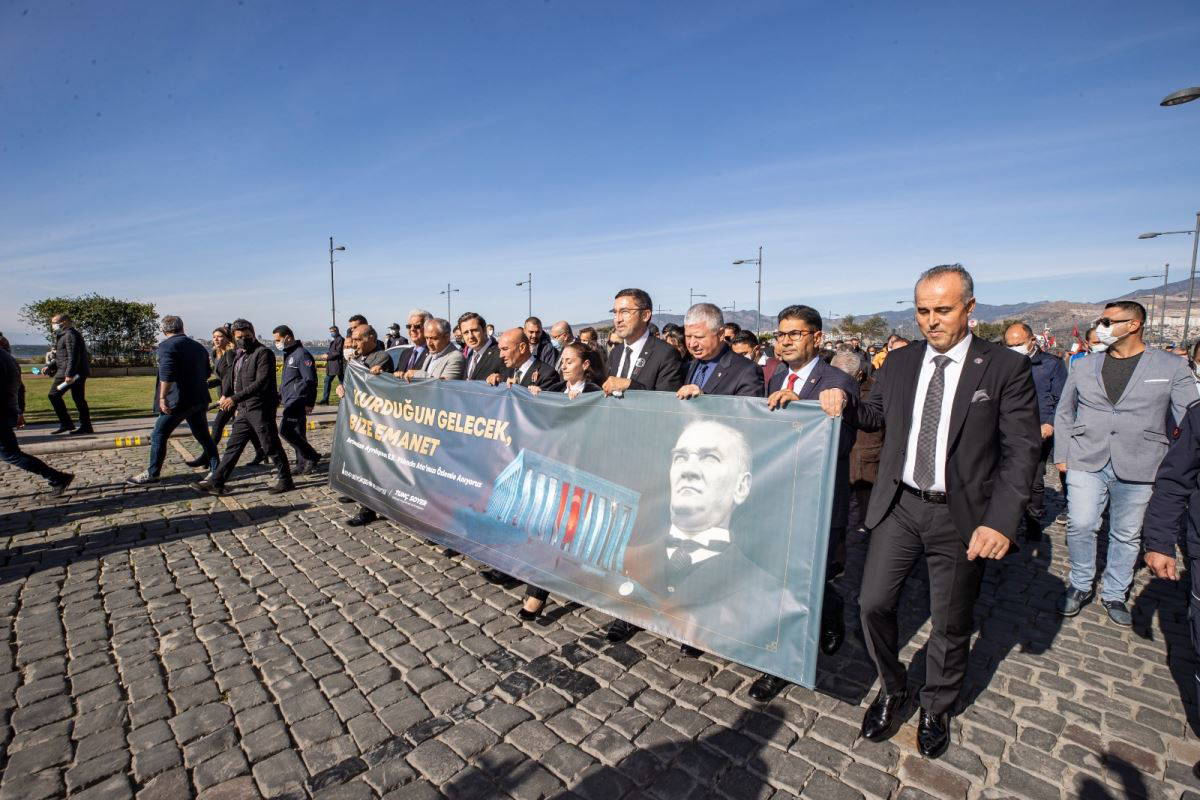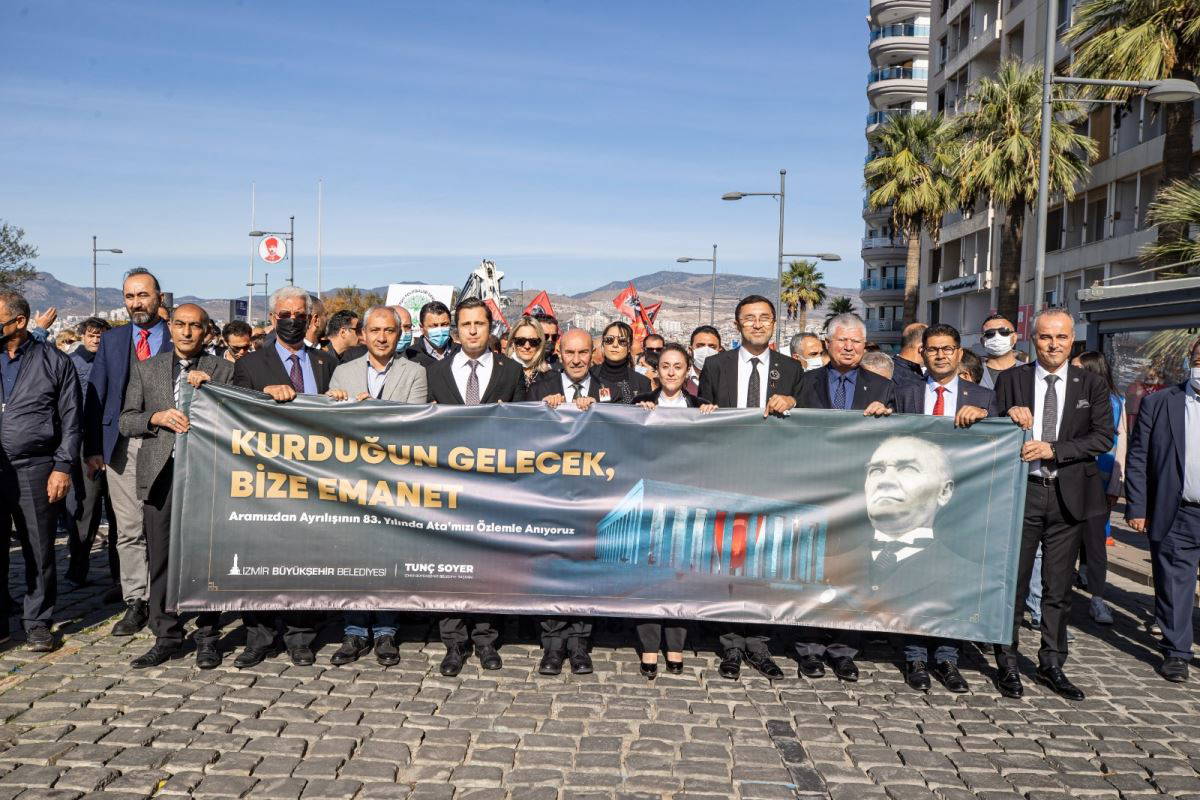 İzmir Büyükşehir Belediyesi’nin Ulu Önder Mustafa Kemal Atatürk’ün aramızdan ayrılışının 83’üncü yıl dönümü için düzenlediği Ata’ya Saygı Yürüyüşü, binlerce İzmirliyi bir araya getirdi. İzmir Büyükşehir Belediye Başkanı Tunç Soyer, İzmir Büyükşehir Belediyesi Başkan Vekili Mustafa Özuslu, CHP İzmir İl Başkanı Deniz Yücel, CHP İzmir Milletvekili Ednan Arslan ile ilçe belediye başkanlarının da katıldığı Ata’ya Saygı Yürüyüşü, Alsancak Limanı önünden başladı. İzmirliler Atatürk’ün 350 metre uzunluğundaki dev posterini taşıyarak Cumhuriyet Meydanı'na kadar yürüdü. Katılımcılar, üzerinde “Kurduğun gelecek bize emanet” yazılı pankart taşıdı.