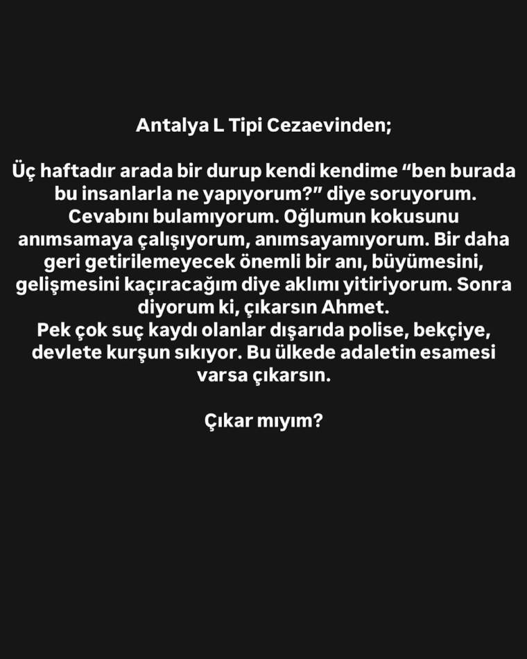 "Antalya L Tipi Cezaevinden; Üç haftadır arada bir durup kendi kendime 'ben burada bu insanlarla ne yapıyorum?' diye soruyorum. Cevabını bulamıyorum. Oğlumun kokusunu anımsamaya çalışıyorum, anımsayamıyorum. Bir daha geri getirilemeyecek önemli bir anı, büyümesini, gelişmesini kaçıracağım diye aklımı yitiriyorum. Sonra diyorum ki, çıkarsın Ahmet. Pek çok suç kaydı olanlar dışarıda polise, bekçiye, devlete kurşun sıkıyor. Bu ülkede adaletin esamesi varsa çıkarsın. Çıkar mıyım?"