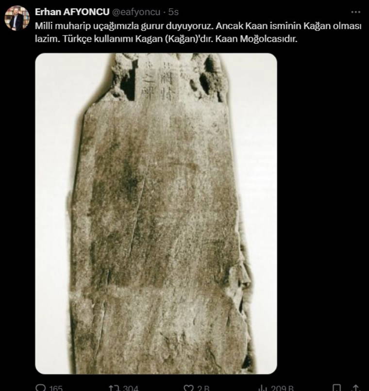 Afyoncu, “Milli muharip uçağımızla gurur duyuyoruz. Ancak Kaan isminin Kağan