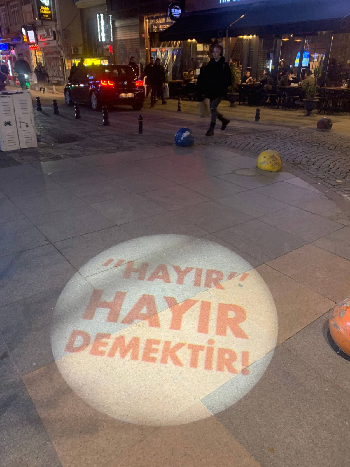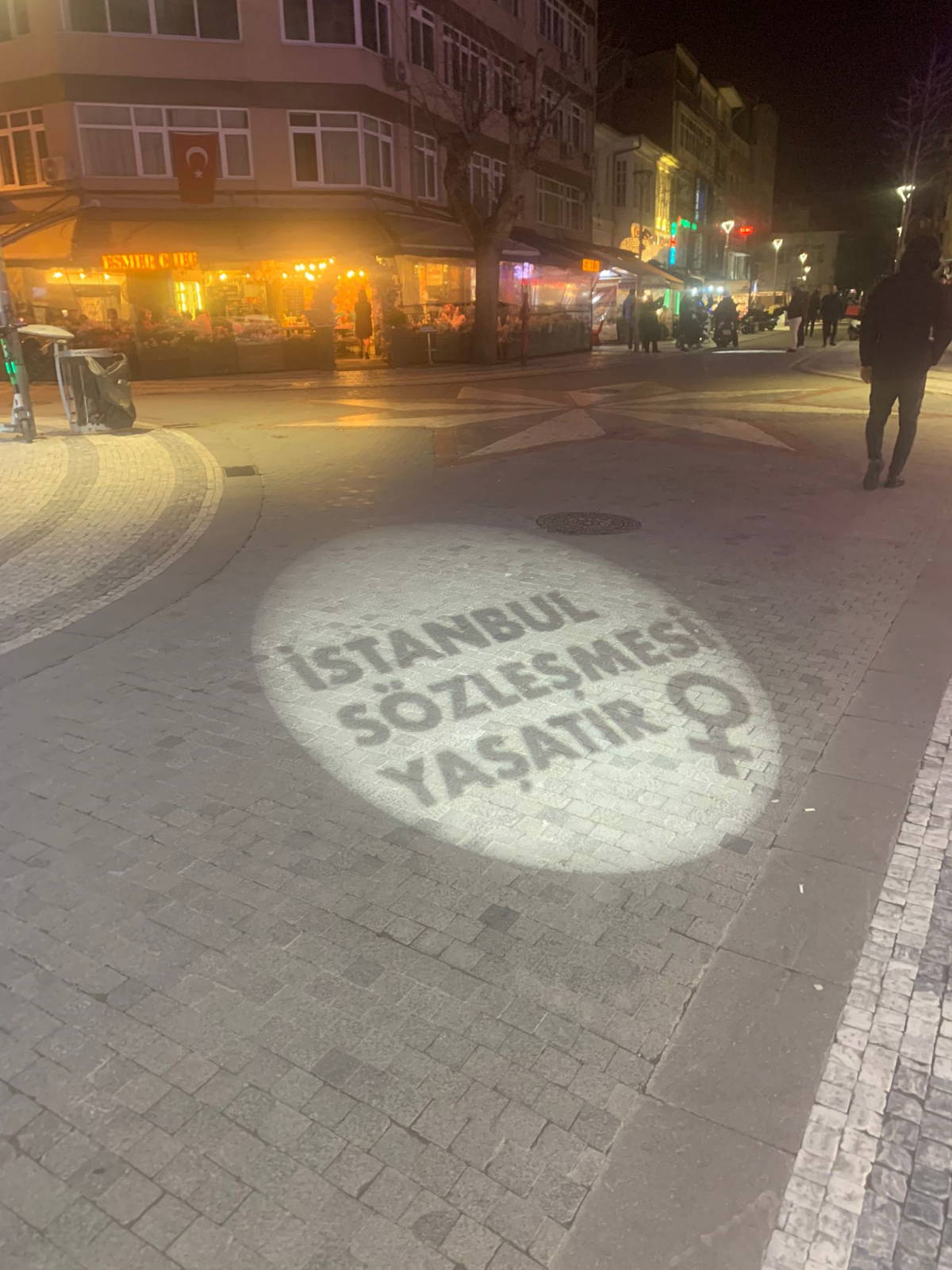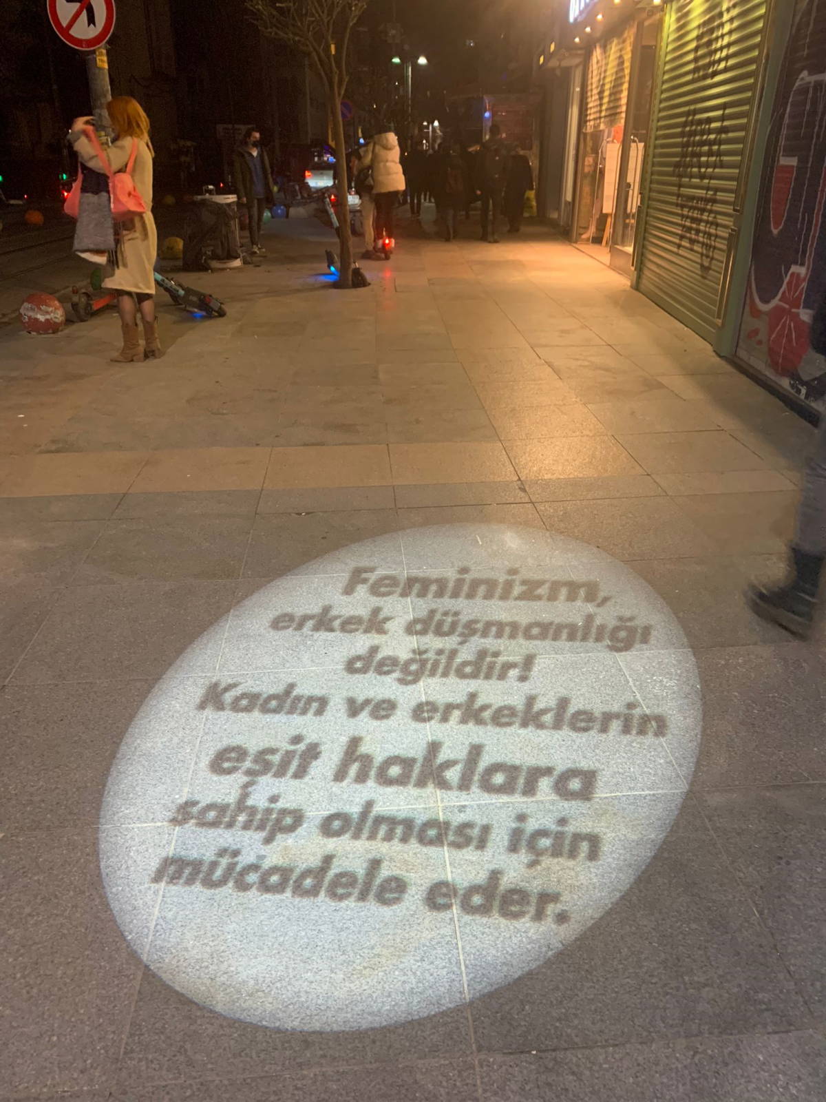 Yere projeksiyon cihazı ile yansıtılan yazılarda İstanbul Sözleşmesi başta olmak üzere kadınların eşit hak talepleri, kıyafet özgürlüğü ve ataerkil düşünceye olan bakış açıları yer aldı.