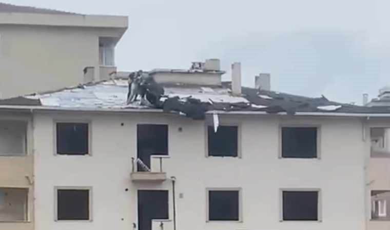 Çatıdaki tehlikeli çalışma cep telefonu kamerasına yansıdı. Görüntülerde, malzemelerin uçuşarak çevreye dağıldığı görülüyor.
