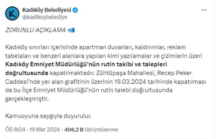 “Kadıköy sınırları içerisinde apartman duvarları, kaldırımlar, reklam tabelaları ve benzeri alanlara yapılan kimi yazılamalar ve çizimlerin üzeri Kadıköy Emniyet Müdürlüğü’nün rutin takibi ve talepleri doğrultusunda kapatılmaktadır. Zühtüpaşa Mahallesi, Recep Peker Caddesi’nde yer alan grafitinin üzerinin 19.03.2024 tarihinde kapatılması da bu İlçe Emniyet Müdürlüğü’nün rutin talebi doğrultusunda gerçekleşmiştir.”