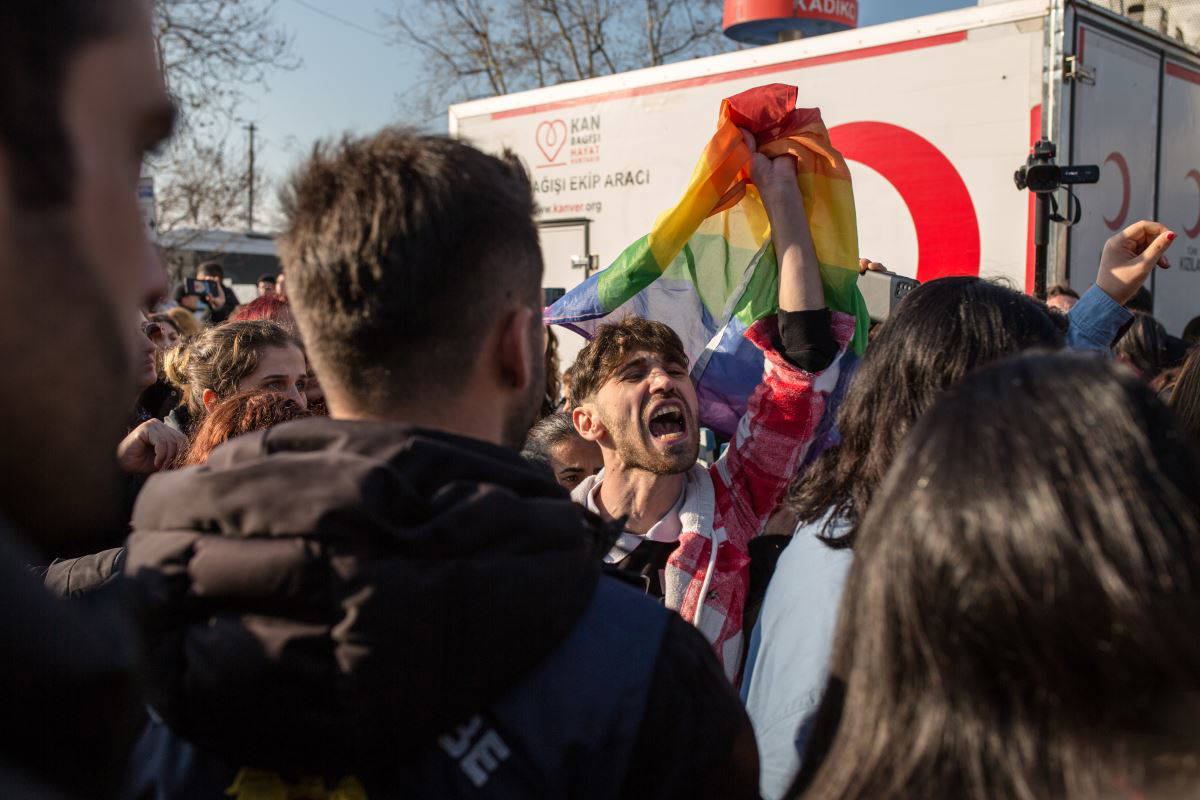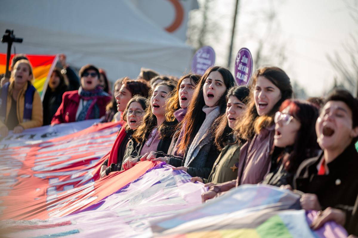 Eylem alanına girişte LGBTİ+ bayrağını içeri almak istemeyen polislerle eylemciler arasında gerginlik yaşandı. Eylemde kadınların 2023’ten beklentileri okundu.