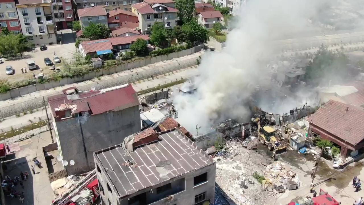 Öte yandan yanan depo ve yangına itfaiyenin müdahale ettiği anlar drone ile görüntülendi.