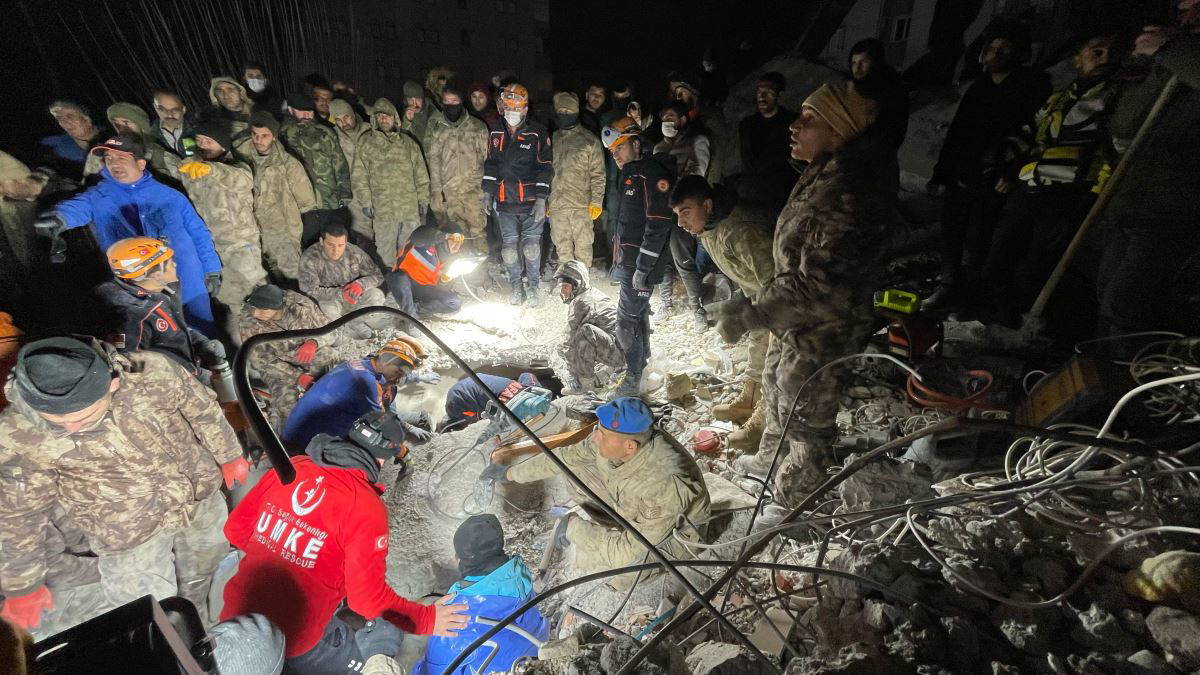 Deprem sonrası Erzurum’dan Hatay’a giden AFAD ekibi, enkazdan canları kurtarıyor. Hatay merkez 600 Evler Mahallesi’nde arama- kurtarma görevi yapan AFAD ekibi, 4 katlı binanın enkazında mahsur kalan 5 kişilik aileyi çıkarmak için sabaha kadar uğraştı. AFAD görevlileri, depremden yaklaşık 30 saat sonra enkazdan ilk olarak Hakkı (7), Selim'i (5) daha sonra 30 günlük olduğu belirlenen Miraç bebeği çıkardı. Binada çalışmasını sürdüren ekipler, baba Yusuf Sümer ile anne Özge Sümer’i de sağ çıkardı. Aile, ambulansla hastaneye götürüldü.