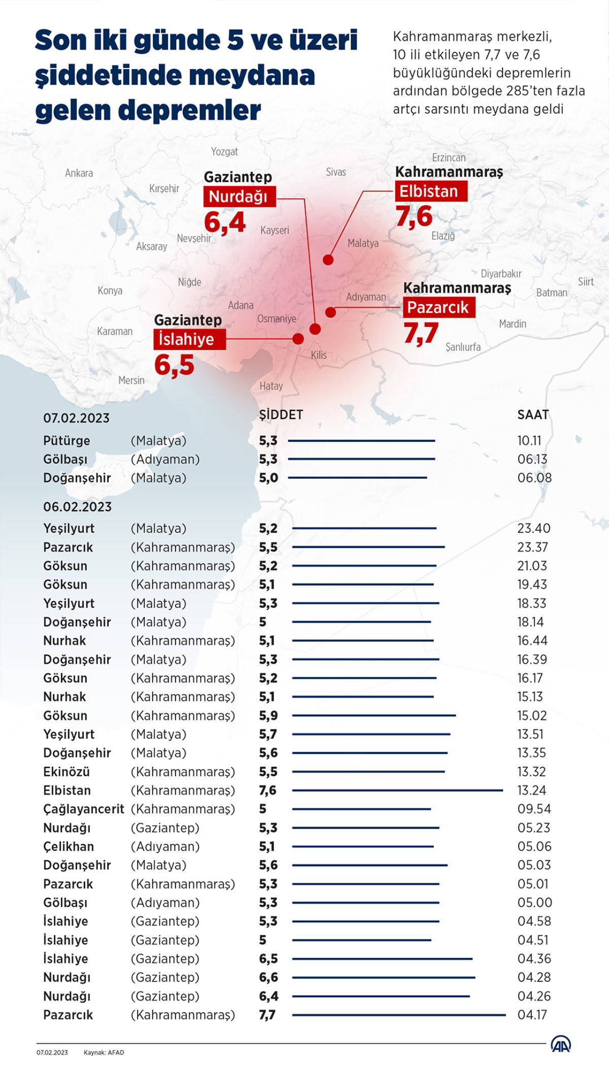 Kahramanmaraş merkezli, 10 ili etkileyen 7,7 ve 7,6 büyüklüğündeki depremlerin ardından bölgede 285'ten fazla artçı sarsıntı meydana geldi.