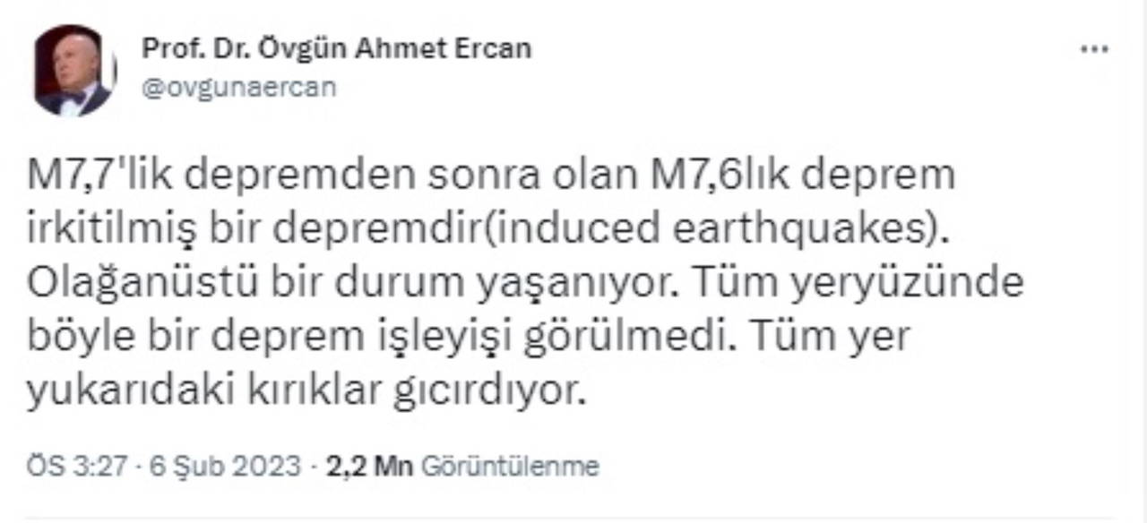 Jeofizik mühendisi Prof. Dr. Övgün Ahmet Ercan, Kahramanmaraş merkezli olarak meydana gelen iki büyük depremin ardından çarpıcı bir değerlendirmede bulundu.
