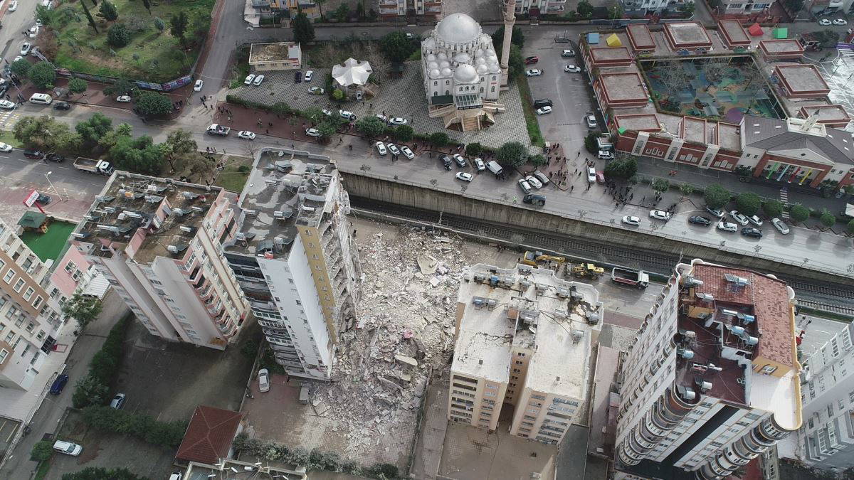 Adana'nın Çukurova ilçesinde 12 katlı Kubilay apartmanı yıkılırken, yandaki apartmanda mahsur kalanların kurtarılmasına çalışılıyor.