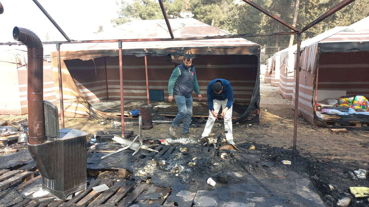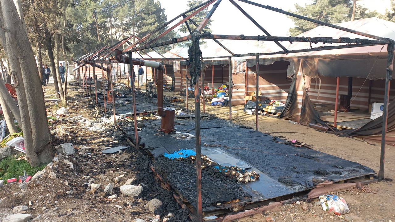 Yangında 7 çadır kullanılamaz hale gelirken buralarda kalanlar başka çadırlara yerleştirildi. Polis, inceleme başlattı.
