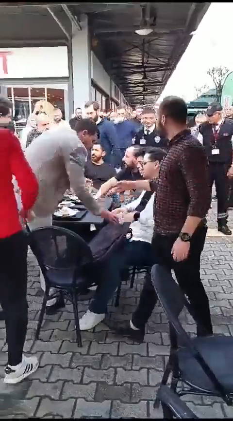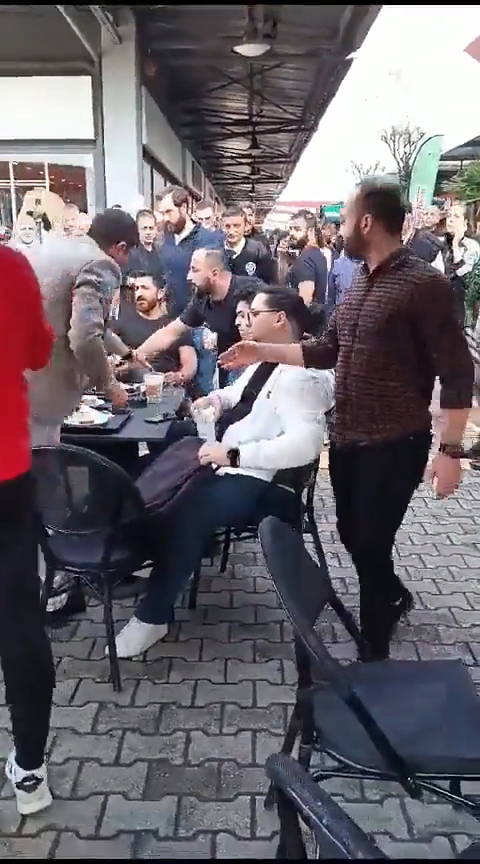 Gruptan bir kişi, yurttaşların oturduğu masaya gidip içecekleri toplayıp attı. Bu sırada masadaki içeceğini kucağına alan bir kişinin kahvesi de aynı kişi tarafından elinden alınıp yere fırlatıldı. Görüntüler, sosyal medyada da tepkilere neden oldu.