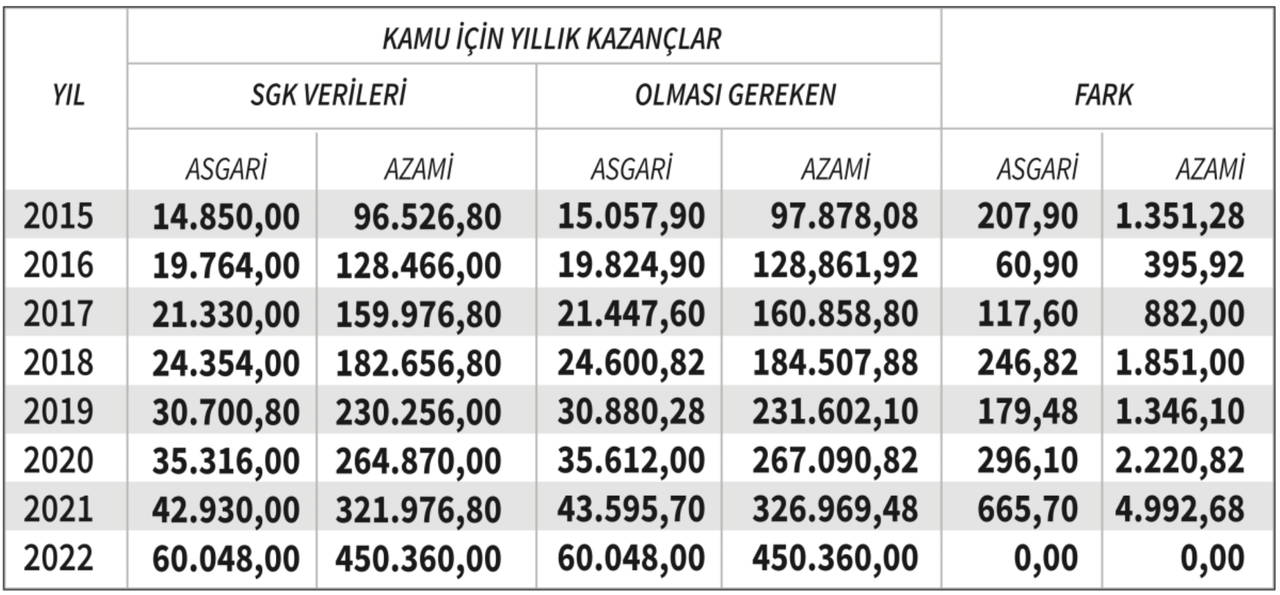SGK tarafından her yılın ocak ayında yayımlanan emekli aylık artışlarına ilişkin genel yazılarda kamu ve özel sektör için yıllık kazançlar 2015 yılından itibaren aynı miktar üzerinden açıklanmakla birlikte, yılın sonunda kamu için kazanç tutarlarının bir sonraki yılın ocak ayı kazancına göre güncellenmesi ve yeniden açıklanması gerekirken bu yapılmıyor. Kamu ve özel sektör asgari ve azami kazançları aynı tutarlar üzerinden aylık bağlama işlemlerinde dikkate alınıyor. 2015 yılı ve sonrasında kamu sektörü için olması gereken yıllık kazançlar aşağıdaki tabloda gösterilmiştir.