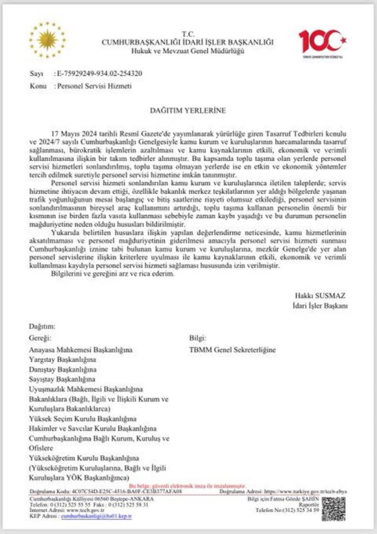 Cumhurbaşkanlığı İdari İşler Başkanlığı Hukuk ve Mevzuat Genel Müdürlüğü tarafından kamu kurum ve kuruluşlarına gönderilen yazıda, servis hizmetine devam edileceği belirtildi.