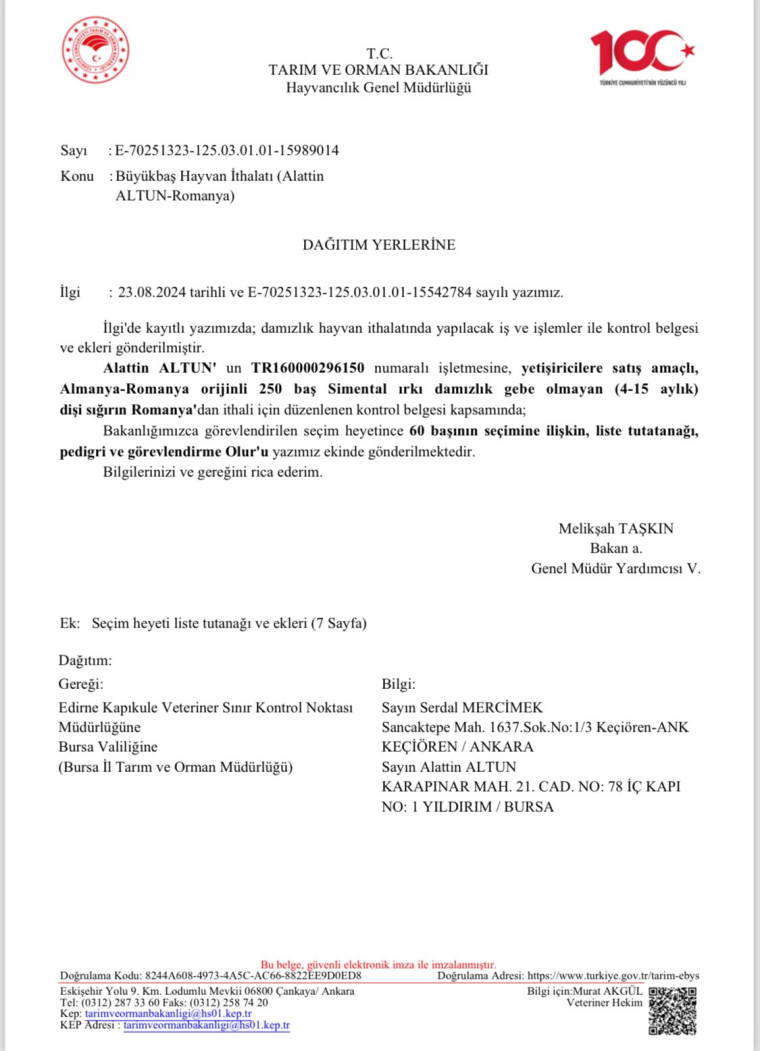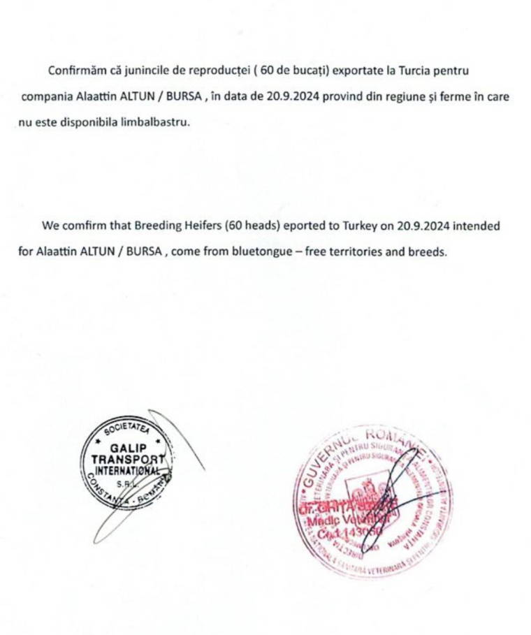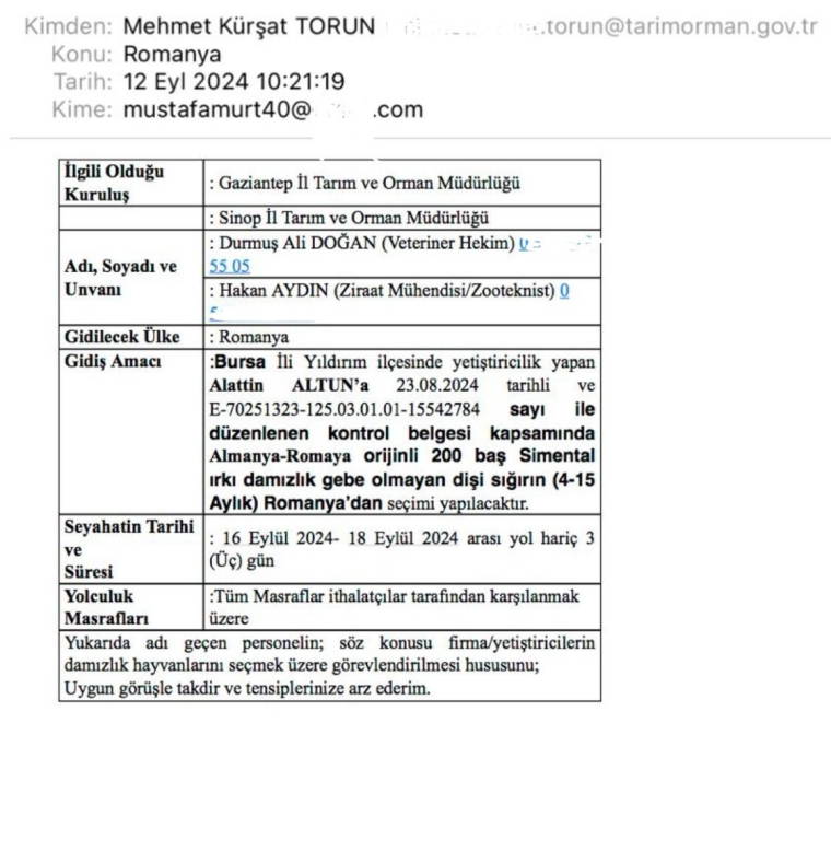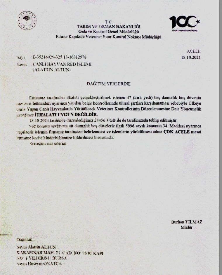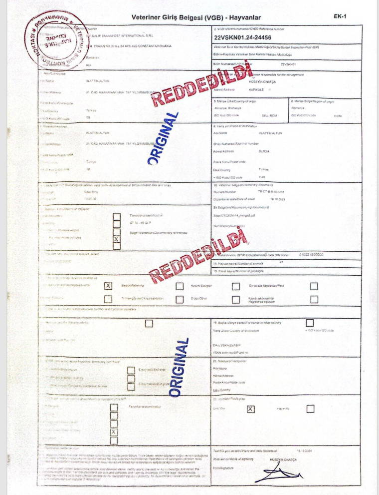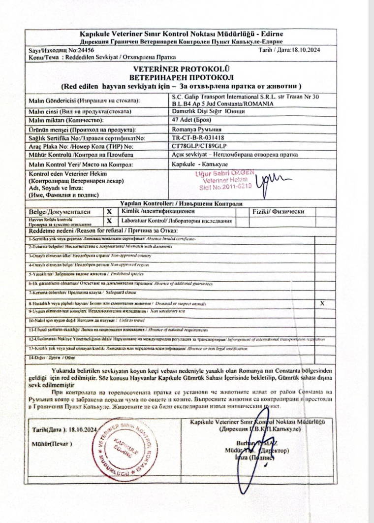 Tarım ve Orman Bakanlığı Hayvancılık Genel Müdürlüğü’nün görevlendirdiği veteriner hekim ile ziraat mühendisi eşliğinde seçimi yapılarak Romanya’dan alınan hayvanların Türkiye’ye girişine izin verilmedi. Gerekçe olarak, belge kontrollerinde alımın “ulusal şartları karşılamaması ve koyun keçi vebası nedeniyle yasaklı olan Romanya’nın Köstence bölgesinden geldikleri” için Tarım ve Orman Bakanlığı Gıda ve Kontrol Genel Müdürlüğünce reddedildiği bildirildi. Oysa hayvanların söz konusu bölgeden ithaline yine aynı Bakanlığın Hayvancılık Genel Müdürlüğü’nün izin verdiğine dair resmi belge ve hastalık taşımadıklarına dair test sonuçları da bulunuyor.