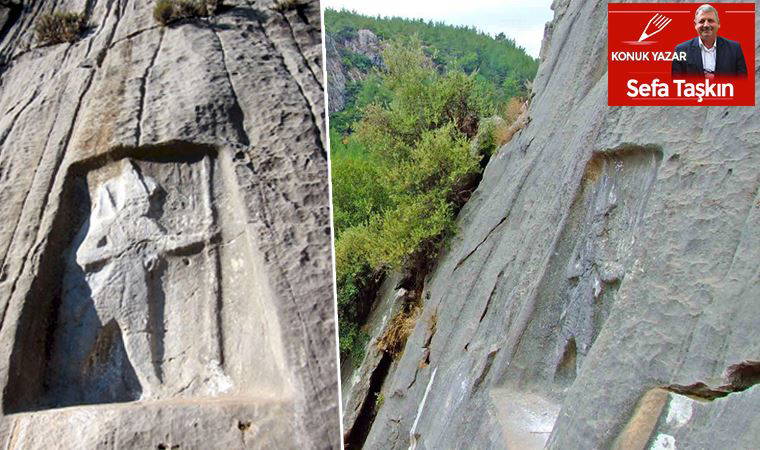 Yaslandığı doğu yükseltisi üzerindeki düz kayalığa işlenmiş resimsel figürler bize, Batı Anadolu tarihinin ilk yazılı bilgilerini veriyor.