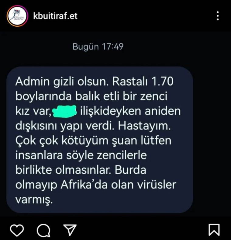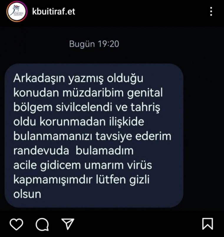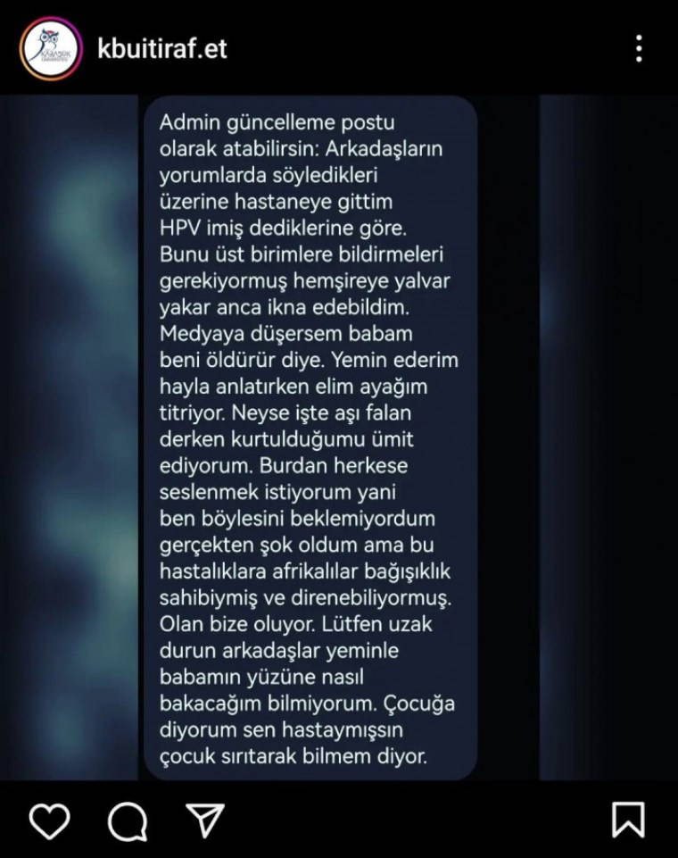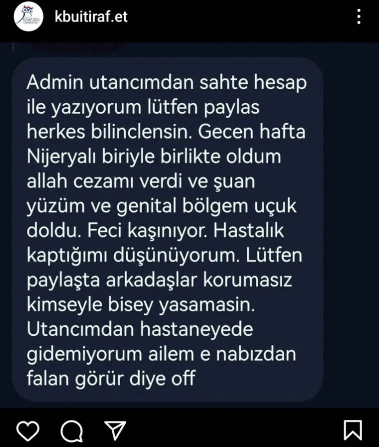 Instagram'daki 'Karabük Üniversitesi İtiraf Sayfası' isimli hesapta siyah öğrencilerle cinsel birliktelik yaşayan Türk erkek ve kadın öğrencilerin 'itirafları' gündem oldu. Kimi HPV kimi de HIV şüphesiyle hastaneye gittiğini anlattı.