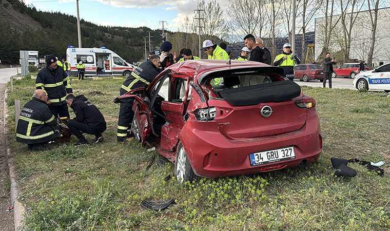 Çarpışmanın etkisiyle yoldan çıkan otomobil refüje savruldu.