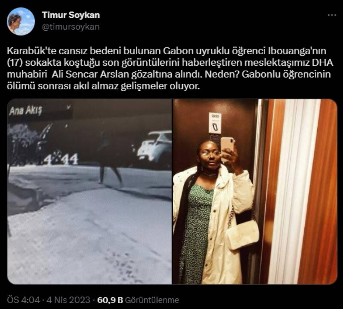 Soykan, "Karabük'te cansız bedeni bulunan Gabon uyruklu öğrenci Ibouanga'nın (17) sokakta koştuğu son görüntülerini haberleştiren meslektaşımız DHA muhabiri Ali Sencar Arslan gözaltına alındı. Neden? Gabonlu öğrencinin ölümü sonrası akıl almaz gelişmeler oluyor" ifadelerini kullandı.