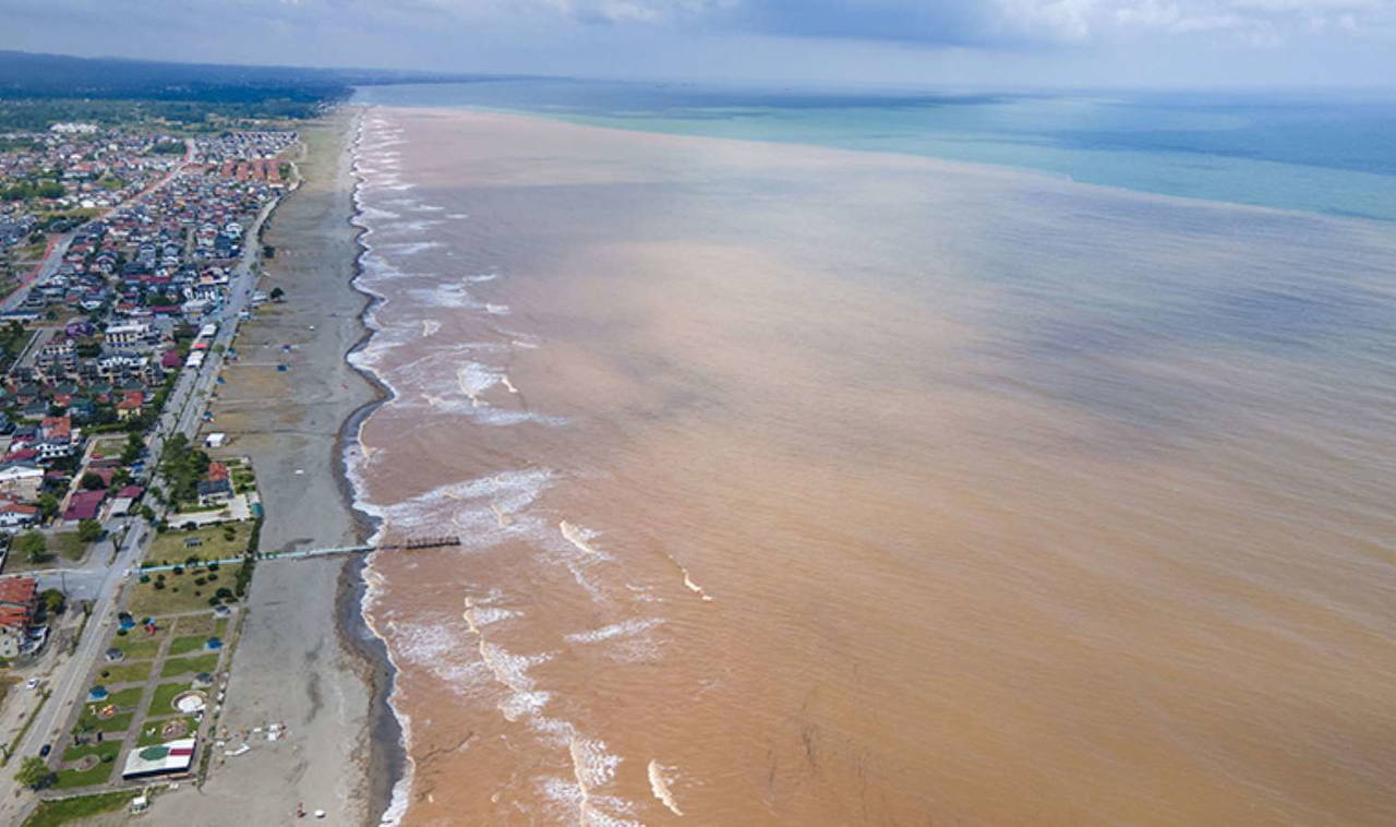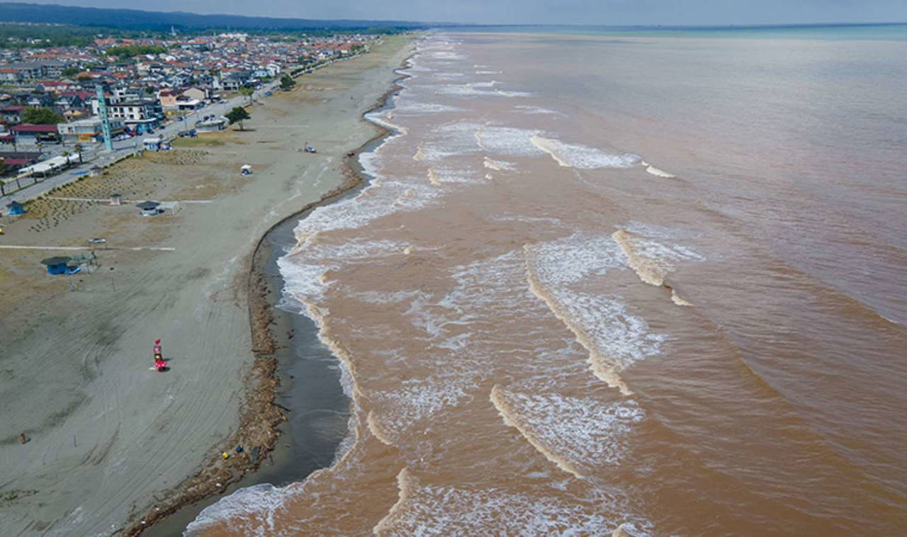 Suyun, rengi kahverengiye dönüşen kıyı şeridi ve kirlilik havadan görüntülendi.
