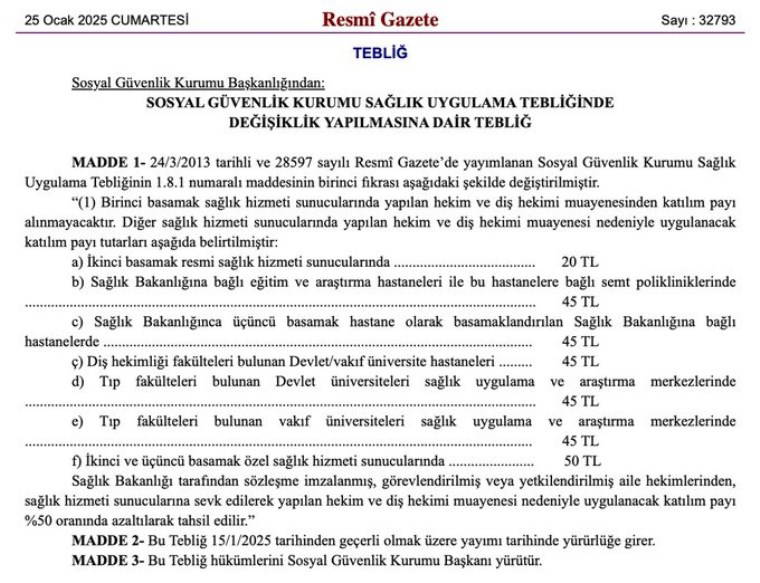 "Bugün Resmi Gazetede yayınlanan Tebliğ ile katsayıdaki artışa bağlı olarak devlet hastanelerine ve tıp fakültelerine başvuru sırasında alınan katılım payı 45 TL oldu.