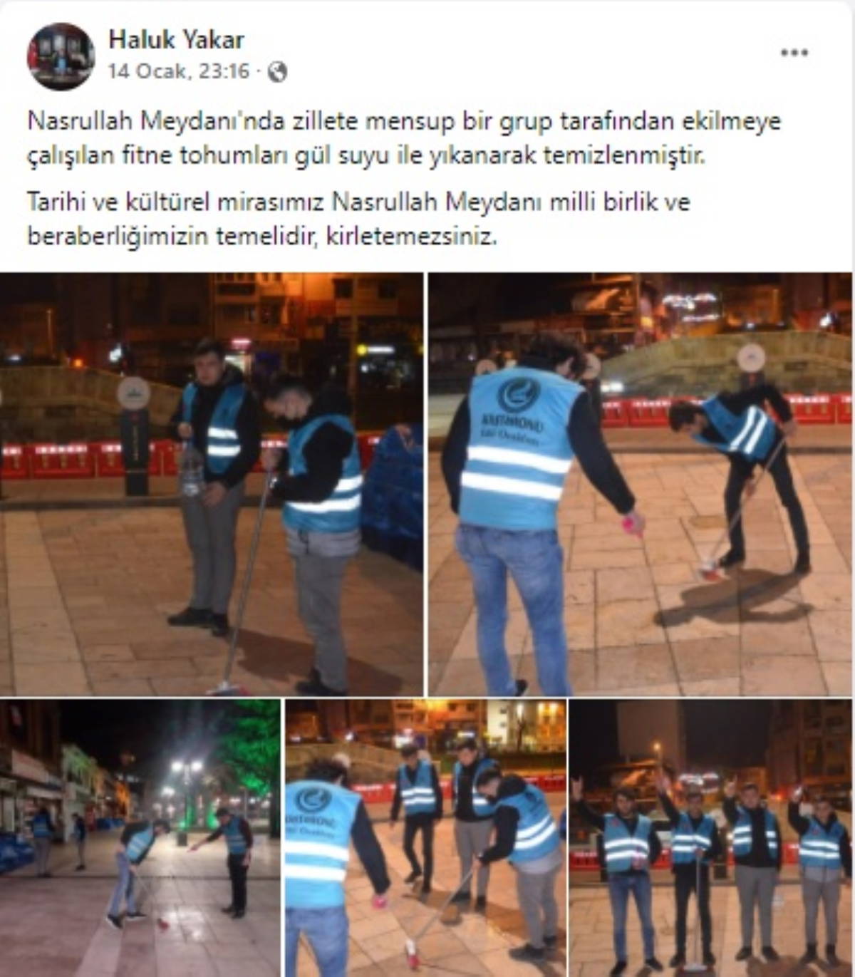 Nasrullah Meydanı’nı gül suyu döküp ellerindeki fırçalarla temizleyen ülkücü gençlerin fotoğrafları hem Kastamonu Ülkü Ocakları’na hem de Kastamonu Ülkü Ocakları Başkanı Haluk Yakar’a ait sosyal medya hesaplarından, “Nasrullah Meydanı’nda zillete mensup bir grup tarafından ekilmeye çalışılan fitne tohumları gül suyu ile yıkanarak temizlenmiştir. Tarihi ve kültür mirasımız Nasrullah Meydanı milli birlik ve beraberliğimizin temelidir, kirletemezsiniz” notuyla paylaşıldı.