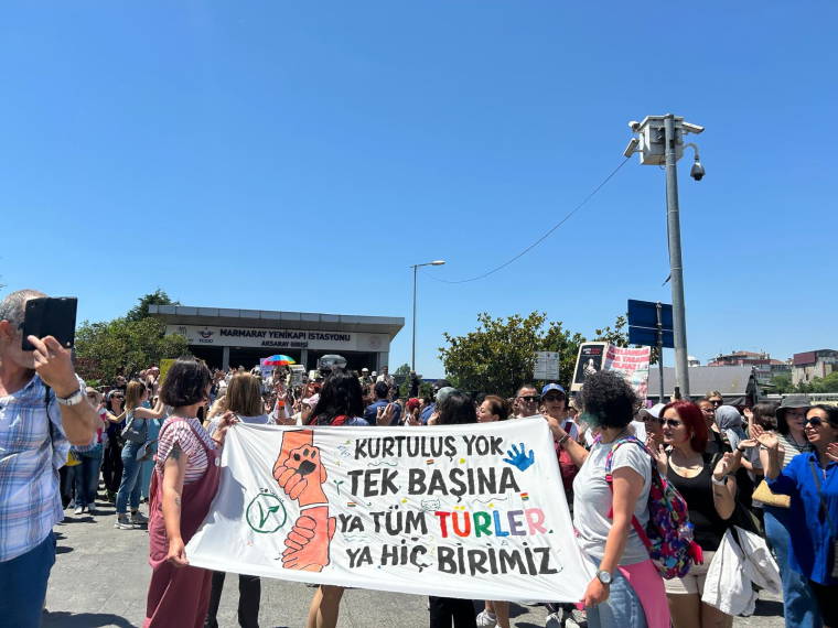 Söz alan Fidan Ataselim ise şöyle konuştu: “Her gün kadınlar öldürülürken kadınları koruyan yasaları işlevsiz hale getiriyorlar. Tıpkı hayvanları koruyan kanunları işlevsiz hale getirdikleri gibi. Öldürülen kadınlara mini etek giymiş diyenler sokak hayvanlarına havlıyor diyorlar. Buna asla izin vermeyeceğiz”