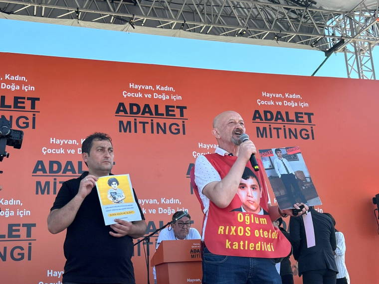 Mitingde Rixos Otel’de 2011 yılında staj yaparken şüpheli şekilde hayatını kaybeden 16 yaşındaki Burak Oğraş’ın babası Murat Oğraş ve Giresun’un Eynesil ilçesinde 6 yıl önce şüpheli biçimde hayatını kaybeden 11 yaşındaki Rabia Naz’ın babası Şaban Vatan da söz alarak adalet çağrısında bulundu.