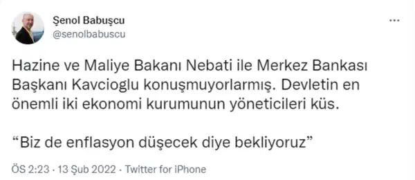 Sosyal medya hesabından paylaşım yapan Ziraat Bankası eski yöneticisi Şenol Babuşcu, ''Hazine ve Maliye Bakanı Nebati ile Merkez Bankası Başkanı Kavcioglu konuşmuyorlarmış. Devletin en önemli iki ekonomi kurumunun yöneticileri küs. Biz de enflasyon düşecek diye bekliyoruz'' ifadelerini kullandı.