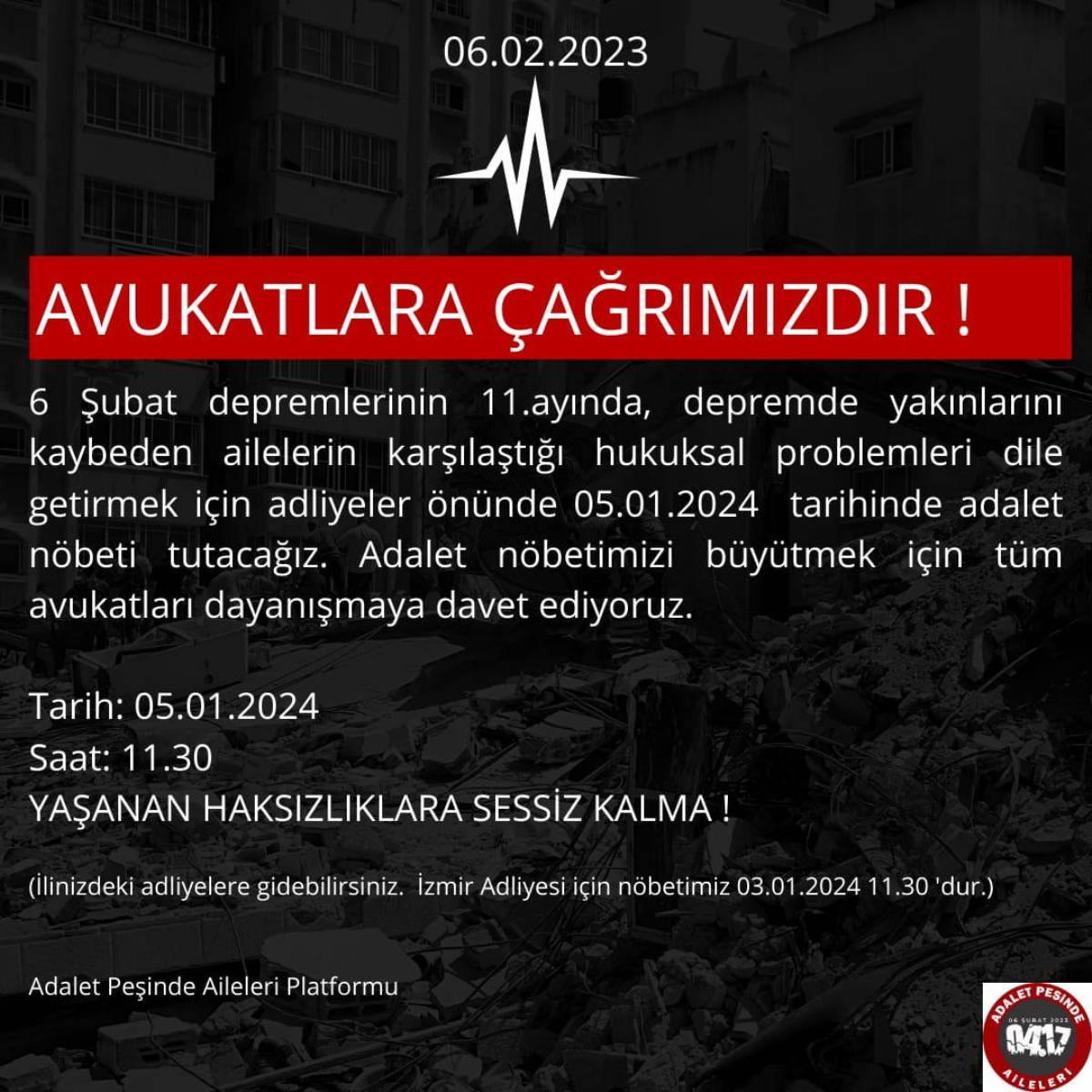 Adana, Adıyaman, Afyon, Ankara Sıhhiye, Antalya, Aydın, Gaziantep, Hatay, İstanbul Çağlayan, İzmir, Kahramanmaraş, Malatya, Manisa, Mersin, Samsun, Trabzon, Uşak ve Van adliyeleri önünde eşzamanlı yapılacak eylem saat 11.30’da başlayacak.